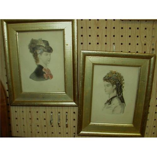of 2 beautiful women wearing great hats. One has feathers and the other has leafs and grapes. The frames are 2" in gold, but has many marks, scratches reflecting their age. The prints are in good shape, have only a few marks on prints. Buyer pays shipping and handling costs.