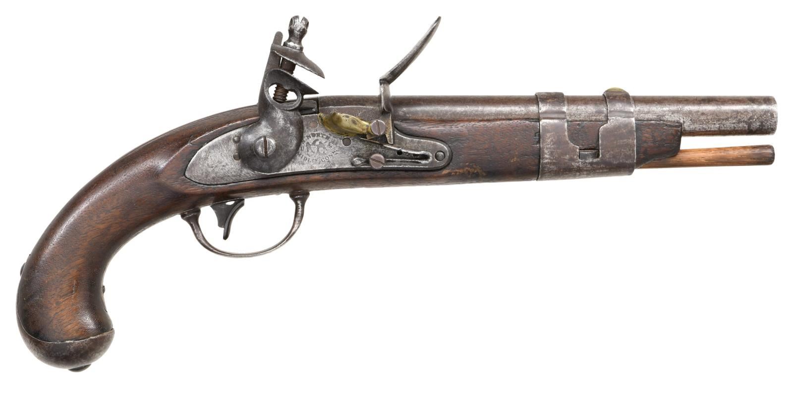NORTH OF MIDDLETOWN, CT. 1) 54 Cal. NSN. Bbl. 9 1/16". An early example of the M1816, probably produced in 1817-18. Round barrel with "US" & "P" on the left side. The lock is marked under the brass pan "S NORTH U (eagle) S MIDLN CONN." Iron trigger guard, buttcap, backstrap, double barrel band, and side plate. Walnut stock shows a light image of a cartouche and has a hickory ramrod with an iron ferrule threaded for cleaning & ball removal. CONDITION: all iron parts have been cleaned and appear mostly bright. Lock holds half cock only. Wood shows the usual dents & dings with a small crack extending from the left barrel channel to the side plate. The cock may be a correct replacement. Fair bore. 2) 54 Cal. NSN. Bbl. 9 1/16". A later example of the M1816, probably produced in 1819-20. Round barrel with "US" & "P" on the left side. The lock is marked under the brass pan "S NORTH U (eagle) S MIDLTN CONN." Iron trigger guard, buttcap, backstrap, double barrel band, and side plate. Walnut stock is clearly stamped "V" behind the side plate. Original hickory ramrod with an iron ferrule threaded for cleaning & ball removal. CONDITION: all iron parts have a medium gray, mottled patina. Lock holds both full & half cock. Wood shows the usual dents & dings. Good bore. PROVENANCE: From the Lifelong Collection of Glen E. Mattox. (01-22403/BF). $1,400-1,800.