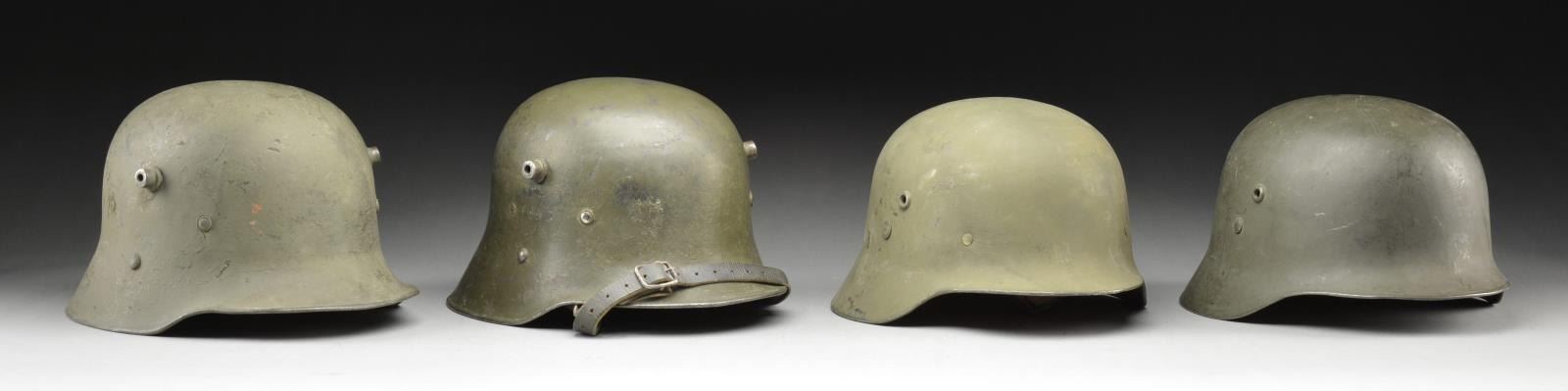 1) M1916 Austrian helmet w/ repainted medium green finish. 3 Pad liner w/ each pad having 2 tongues. Later black chin strap. No stampings are discernable in the helmet. CONDITION: repainted finish is approx. 85%. Liner & chinstrap are solid.