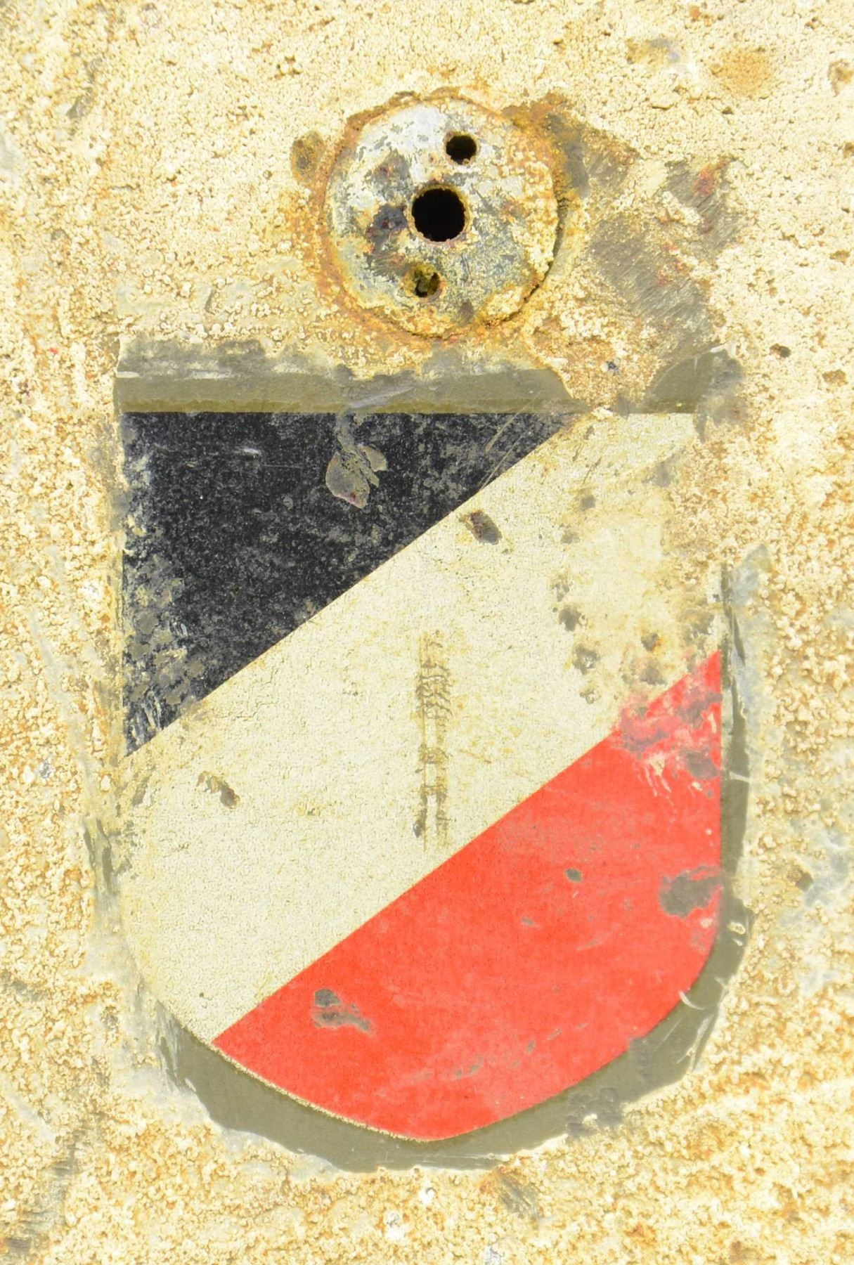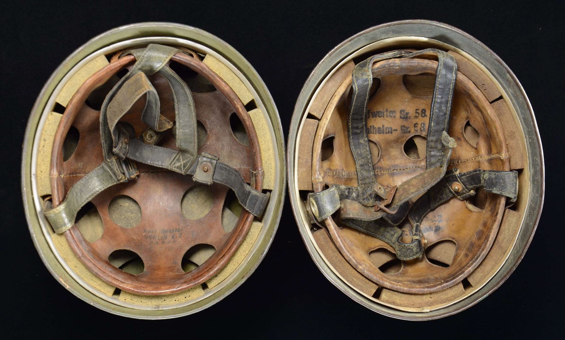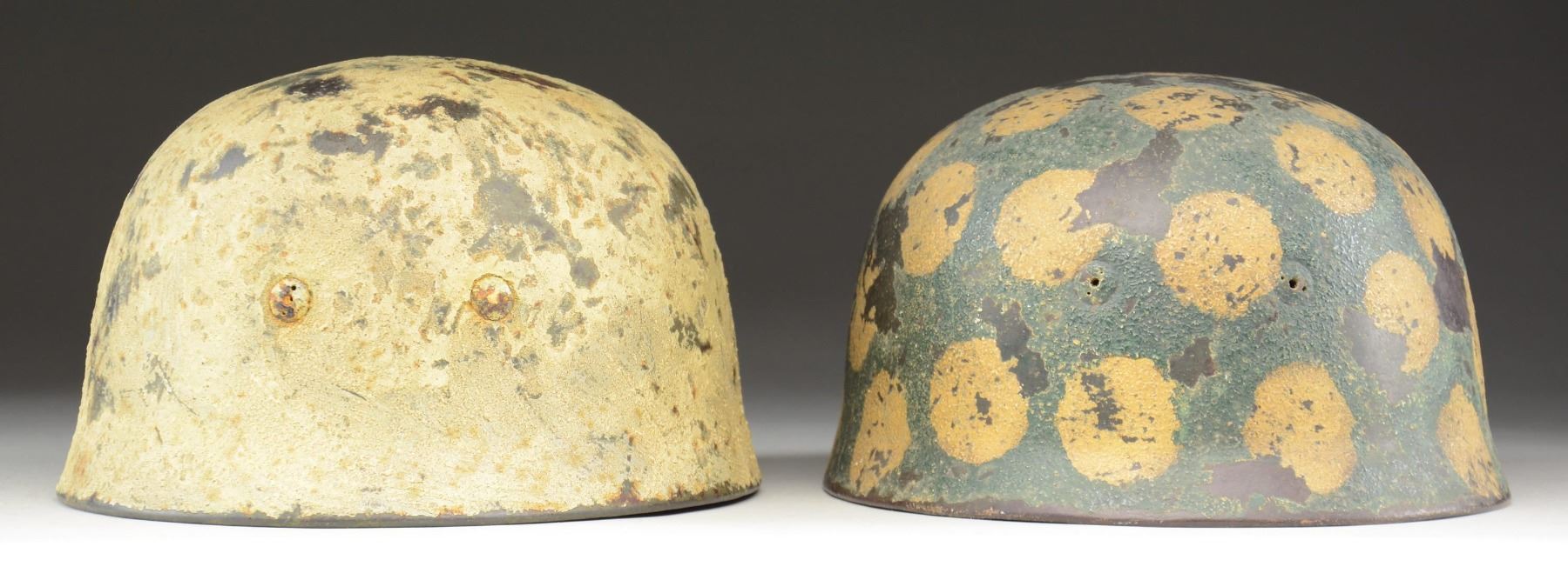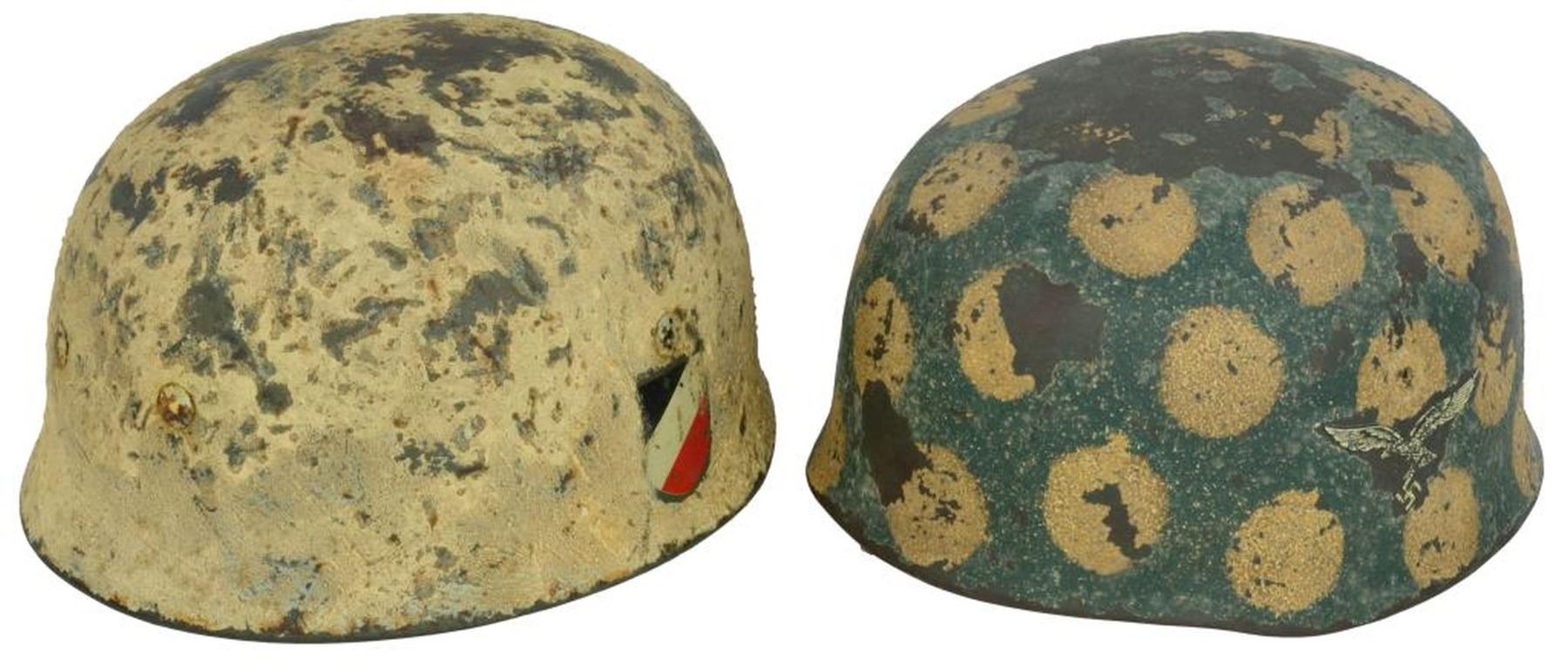 RESTORATION. 1) A fallschirmjager helmet with a painted finish that is extremely thick textured white camouflage. This double decal helmet has a Luftwaffe eagle on the left paired with the National colors decal on the right. The helmet is complete with harness and liner stamped "Kopfweite Gr 57 Stahlhaube Gr 68" & "Karl Heister BERLIN C.2 D.R.G.M.a.". Rear inside of helmet stamped "2141". Left inner side stamped "ET68". Shell, harness, and liner appear to be original and correct. However, the painted camo finish and decals appear to be post-war additions. Much attention has been paid to the details of this restored helmet. CONDITION: painted finish is 60% intact. Luftwaffe decal is 70%. National decal is 85%. Harness and liner show moderate wear. (02-23333/BF/BS). 2) This helmet's painted, camouflaged finish consists of a thick green base with numerous tan dots applied over the base. Helmet features a single Luftwaffe decal on the left side. Harness and liner are intact. Liner is marked "Kopfweite Gr 58 Stahlhaube Gr 68" & "Baumuster Heisler. Berlin C2 Hersteller. F. W. Muller jr". The entire helmet appears to be original and correct with the exception of the painted camo finish, which is of post-WWII origin. CONDITION: camouflage finish is approx. 70% intact. Harness and liner show moderate wear but are quite solid. Decal approx. 65%. (02-23334/BF/BS). $1,400-2,000 for lot.