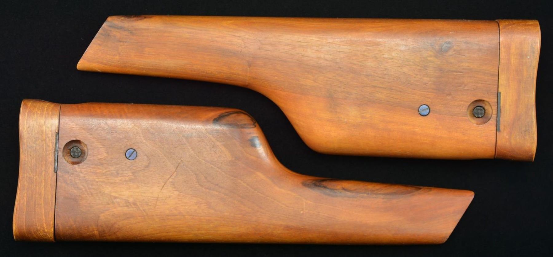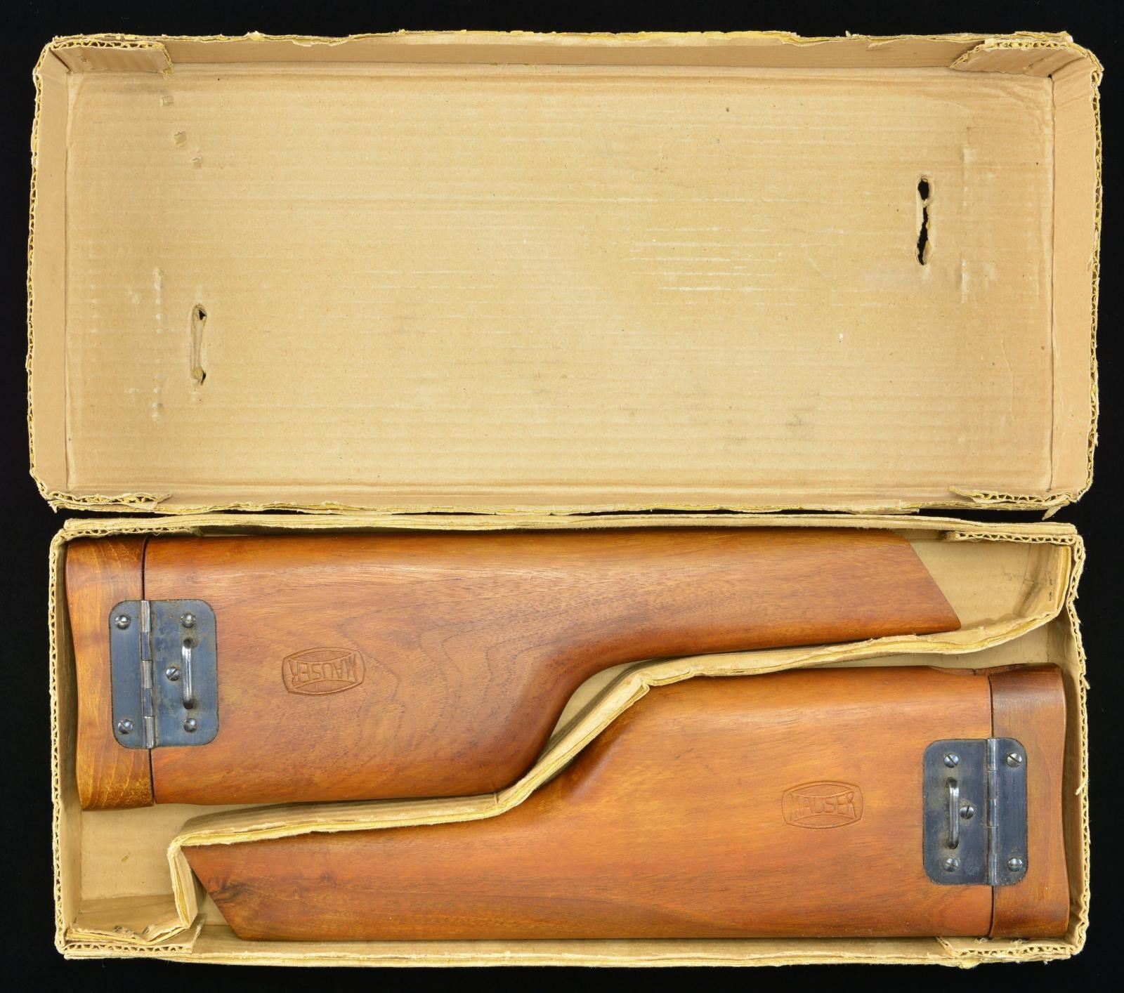 MODEL C98 HOLSTERS. 1 & 2) Mauser banner marked having all proper hardware that is correctly blued. Two units having finish and some very faint handling marks. Hinges have some light peppery oxidation. New and never installed as they do not have attachment iron. Original compartmentalized box fitted for two. Consignor states for Bolo, but may possibly be used for others. (02-16945-8/NW). 3) Good brown leather flap holster w/ shoulder strap plus 2" wide belt loop on back. Designed to encase entire pistol including handle. Strap attached to flap w/ Chinese Star shaped stitching that secures to brass stud having verdigris. Marked w/ Chinese characters on underside of flap plus carefully duplicated on paper (no translation). Illustrated on page 265 of 'THE BROOMHANDLE PISTOL 1896-1936" by Erickson & Pate and 4) Good sm. sized flap holster that leaves part of grip exposed. Flap has 2 snaps w/ decorative stitched Chinese Star at midpoint. Unmarked w/ stripper clip pouch angularly attached to front having snap latch. Back of holster has 12" section of shoulder strap w/ buckle. Two long brass rivet attached belt loops on back that will accept 3 1/2" belt. Straps have 2 rivets per end (1 missing) w/ verdigris. (02-16946-2/NW). $800-1,200.