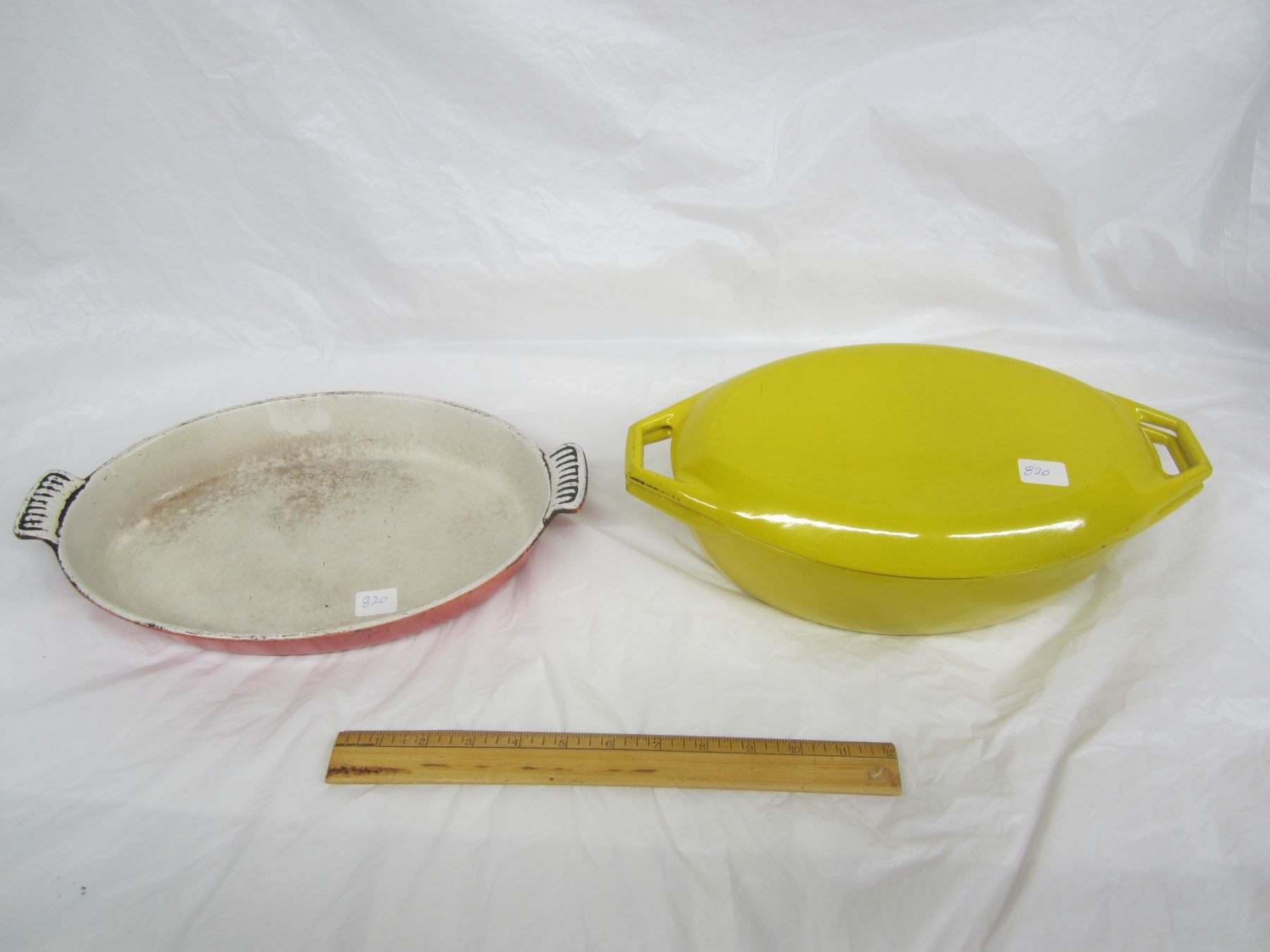 2 MCM made in Belgium Roaster Pots one with Lid Yellow 1 without Lid Red Cast Iron with Enamel Coating