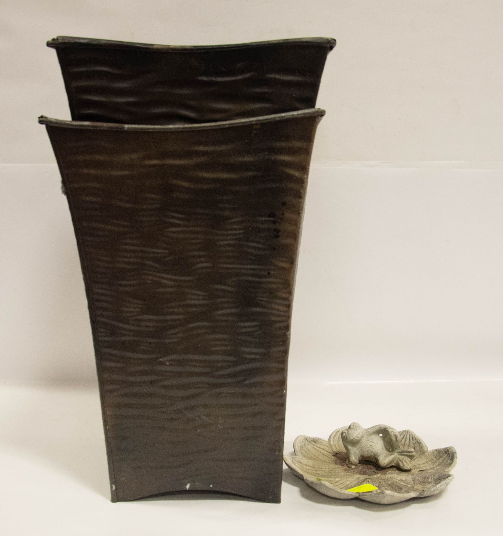 2 METAL PLANTERS 15 IN TALL, MINI FROG BIRDBATH
