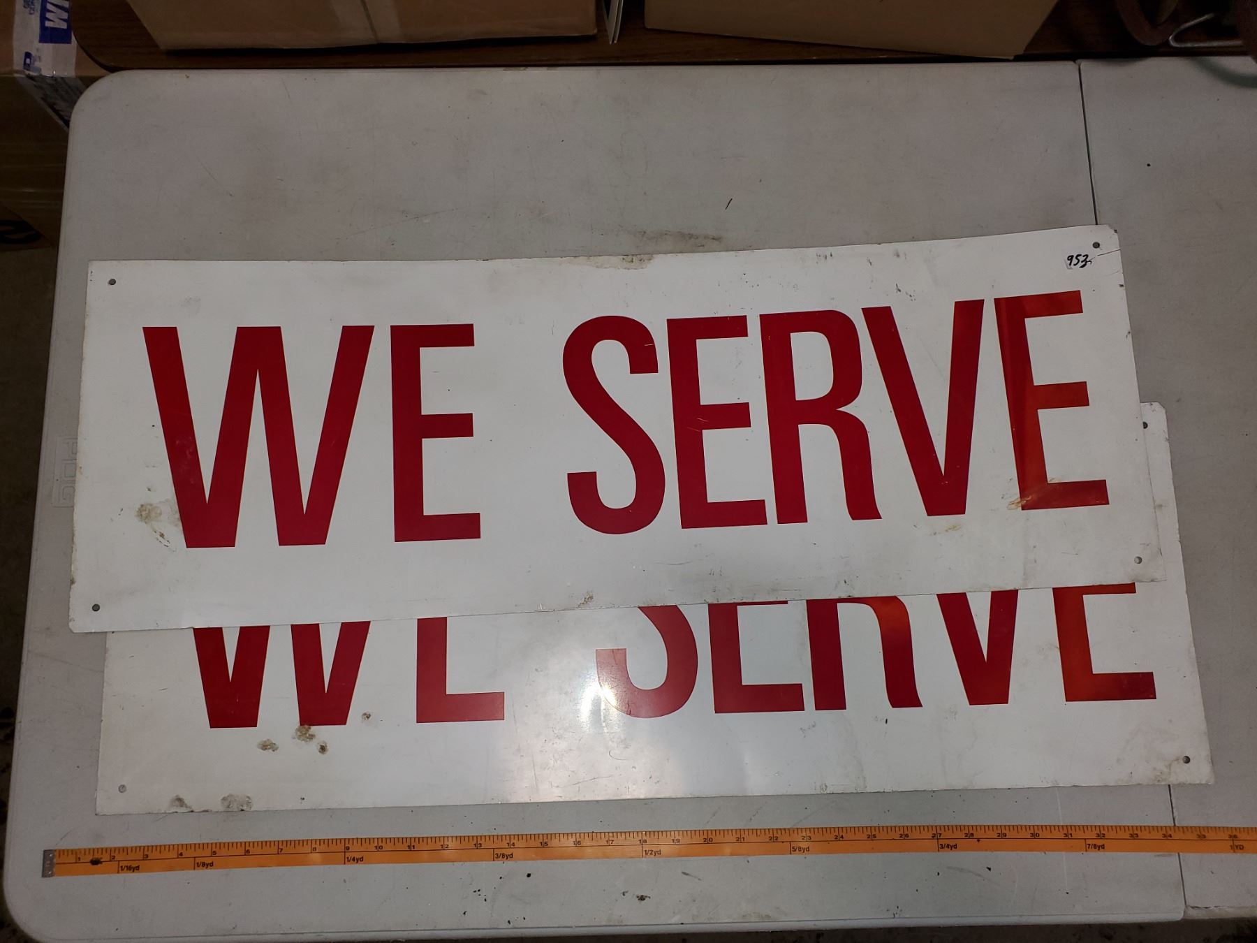 2 METAL 'WE SERVE GASOLINE' SIGNS 12" X 34.5" TIN