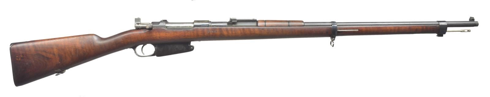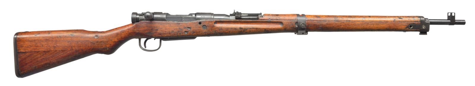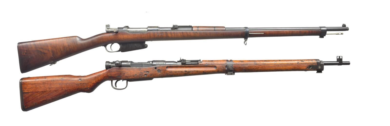 1) ARGENTINE M1891 MAUSER. Cal. 7.65 Arg. S# A5739. Bbl. 29". All visible numbers match. Receiver marked on left rail "MAUSER MODELO ARGENTINO 1891 MANUFACTURA LOEWE BERLIN." Crest has been removed. Straight bolt handle has had knob removed. Ladder rear sight graduated to 2000m. Inverted "V" front sight. Cleaning rod is present. Walnut stock set. Stock marked underneath grip w/ "shield AG" acceptance mark. CONDITION: stock set has moderate wear, staining & handling marks throughout. Several sm. filled gouges on right side of butt near heel. Tiny crack behind receiver tang. Metal has high percentage of original blue w/ thinning & wear. Firing pin has been broken & rear portion is missing, but cocking piece is included w/ rifle. Bore is shiny but w/ well worn lands. (01-19086/RW). ANTIQUE. 2) JAPANESE TYPE 99. Cal. 7.7 Jap. S# 82170. Bbl. 25 1/2". All visible numbers match. Receiver marked on left side w/ interlocking circles indicating mfg. at Kokura Arsenal. "Mum" has been ground leaving type 99 characters. Ladder aperture rear sight w/ anti aircraft wings. Inverted "V" front sight w/ protective ears. Bolt handle has oval knob. Notched, checkered safety knob. Cleaning rod is not present. 3 Screw upper band. Lower band fitted for monopod which is not present. Hardwood stock set w/ full length handguard. Small recoil bolt. 2 screw rear swivel & cup type buttplate. CONDITION: original finish stock set has moderate to heavy wear, dents, scratches & staining throughout. Stock has lg. crack on left side of grip area extending forward to front of trigger guard bow. Metal retains 60% original blue w/ thinning wear & patina. Upper band rear retaining screw is not present. Very good shiny bore. (21-1050/RW). CURIO. $400-600.