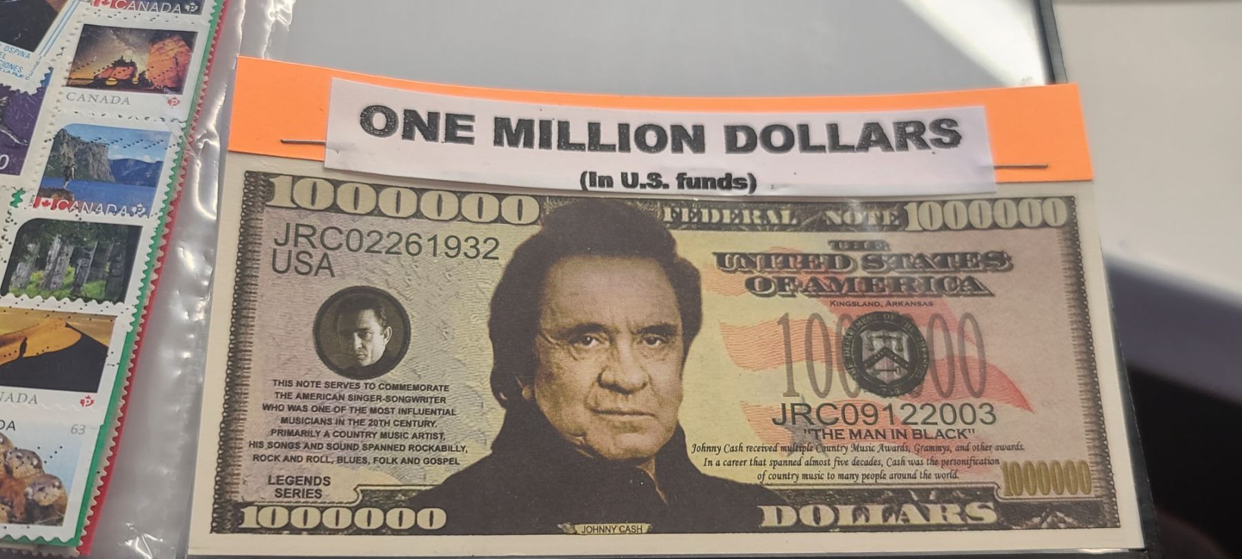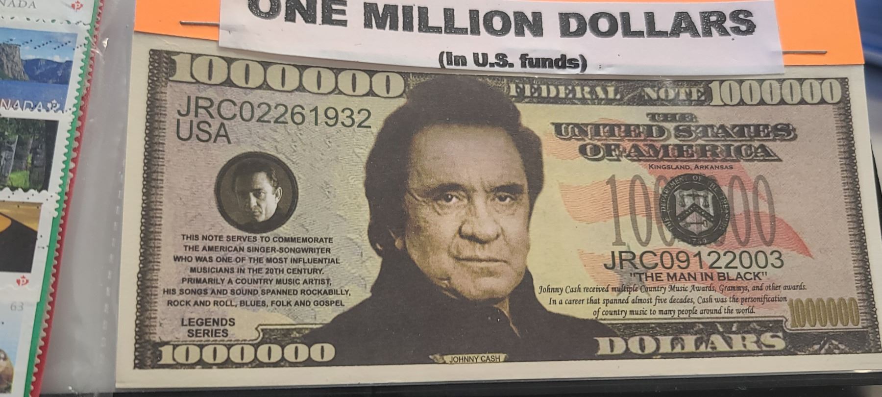 $2 MILLION DOLLARS (LEGENDS SERIES) ONE MILLION JOHNY CASH BILL AND ONE MILLION ELVIS BILL PLUS SMALL COLLECTION OF STAMPS