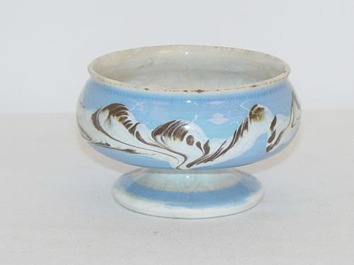 2" MOCHA WARE PEARLWARE PEDESTALED OPEN SALT W/ EARTHWORM DECORATION ON WIDE LIGHT BLUE BAND W/ BLUE BAND ON FOOT - GLAZE WEAR, CRAZING & STAINING