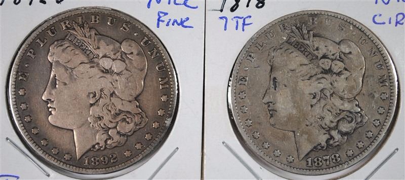 2 MORGAN DOLLARS, 1878 7TF & 1892-S, BOTH NICE CIRC
