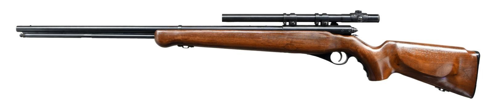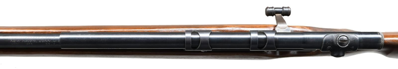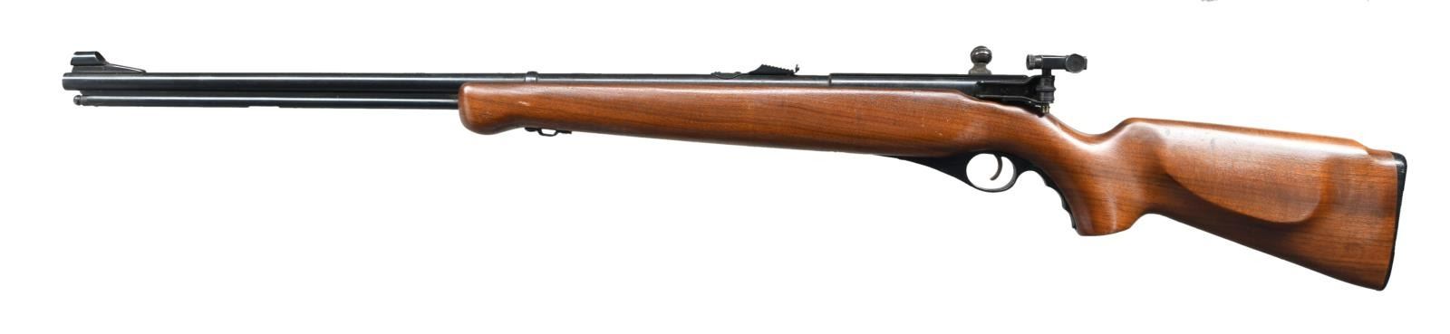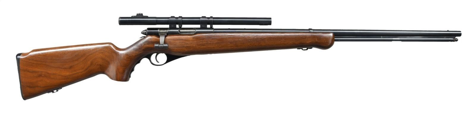 ALL: Cal. 22 S - LR (22 S, L, LR). NSN. Bbls. 26". 1) MODEL 146 B-A. Hooded post front, elevator rear & Mossberg S-130 receiver sight. Grooved receiver. Hardwood stock. CONDITION: good blue w/ pinprick oxidation throughout. Very good stock finish missing rear sling mount, colored safety dots & deep marks. (23-1588/MD). 2) MODEL 146 B. Removed front sight & rear sight. Mossberg M4D scope w/ crosshairs on tip off rings. Walnut stock w/ sling slots. CONDITION: very good blue. Stock has repaired break at wrist, balance ver good w/ light handling marks. Very good bore. (23-1589/MD). ALL CURIO. $300-400.