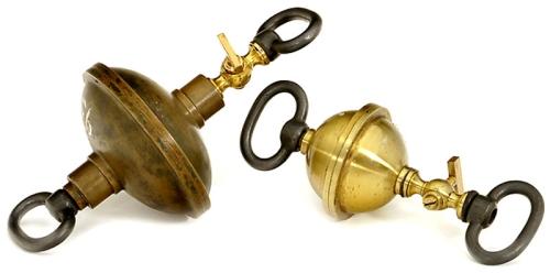 2 Magdeburger Halbkugeln Physikalische Instrumente zur Darstellung des Luftdrucks, Messing mit Eisengriffen, jeweils eine Halbkugel mit Ventil, Ø 12,5 und 8,5 cm – gut erhalten! 2 Magdeburg Hemispheres Accessories to show the existence of a vacuum through the operation of air pressure. Brass with iron handles, Ø 5 and 3 1/2 in., good condition! – (2–3/2) – € 150/220 – (300/1)