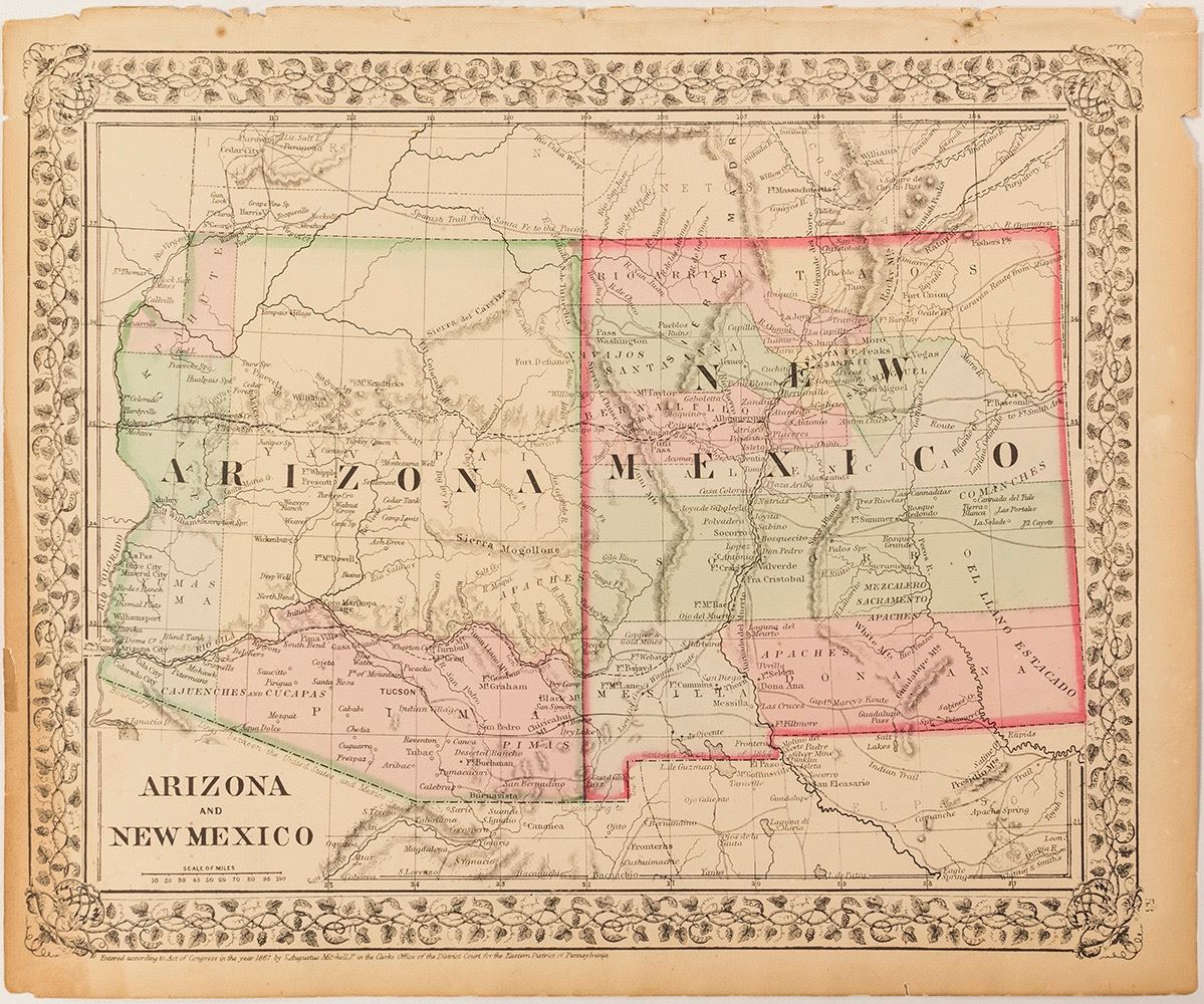 1 map of Arizona and New Mexico by S. Augustus Mitchell Jr., Eastern District of Pennsylvania, Clerks Office of the District Court, Page 53; 12.25" x 15.2". 1 County Map of Arizona & New Mexico 1878 by S. Augustus Mitchell in the Office of the Library of Congress at Washington. Page 92. 12.25" x 15.25". Date: 1867 Location: Arizona HWAC # 54221