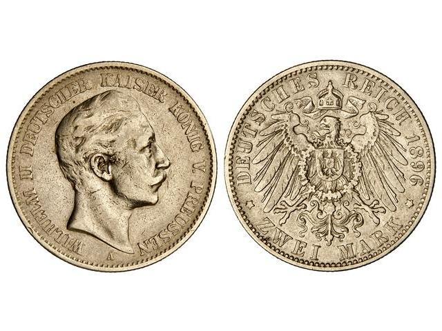 2 Marcos. 1896-A. GUILLERMO II. PRUSIA. AR. (Pequeños golpecitos en anverso). KM-522. MBC.