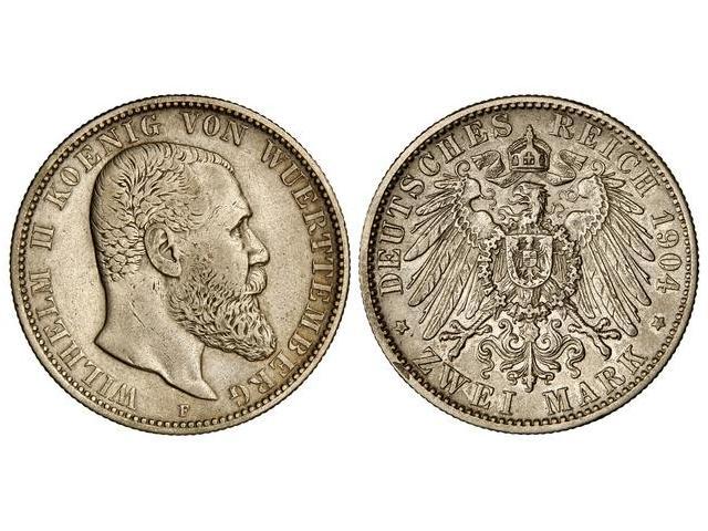 2 Marcos. 1904-F. GUILLERMO II. WURTTEMBERG. AR. (Pequeños golpecitos en anverso). KM-631. MBC/MBC+.