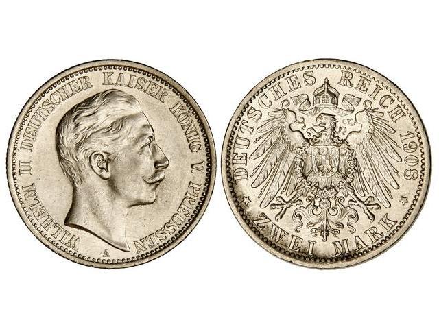 2 Marcos. 1908-A. GUILLERMO II. PRUSIA. AR. (Pequeños golpecitos en anverso). KM-522. EBC/EBC+.