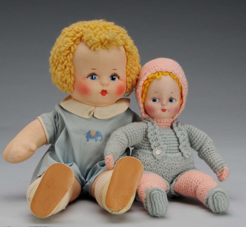 American, 1940s. Chubby toddler with yellow yarn hair, painted features, stitch jointed shoulders and hips, original blue cotton romper, shoes and socks, of the type made by Krueger. Stain on arm. Baby with completely knitted body and clothes, no tags on either. Condition (Excellent). Size Largest: 16" T.