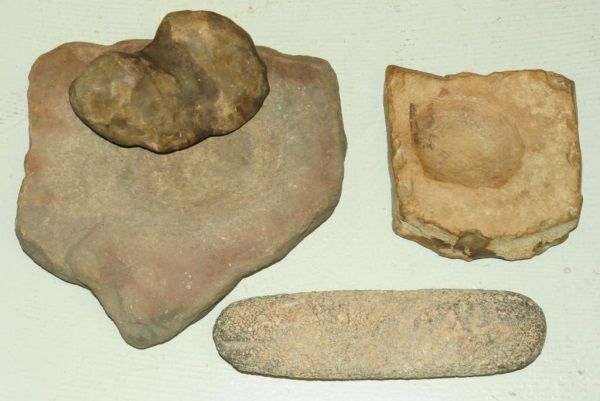 2 pedestals with 2 grinding stones & one large Larger measures approximately 13" x 14" x 4".