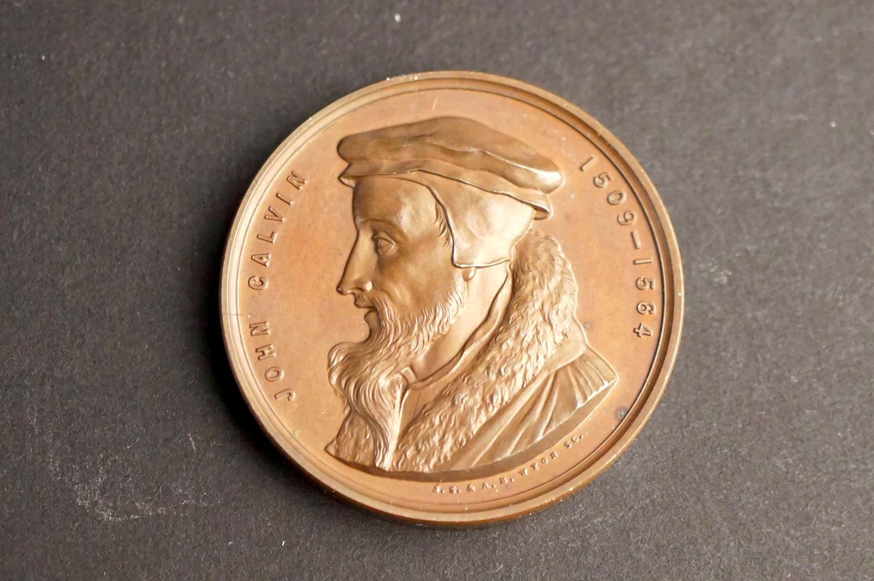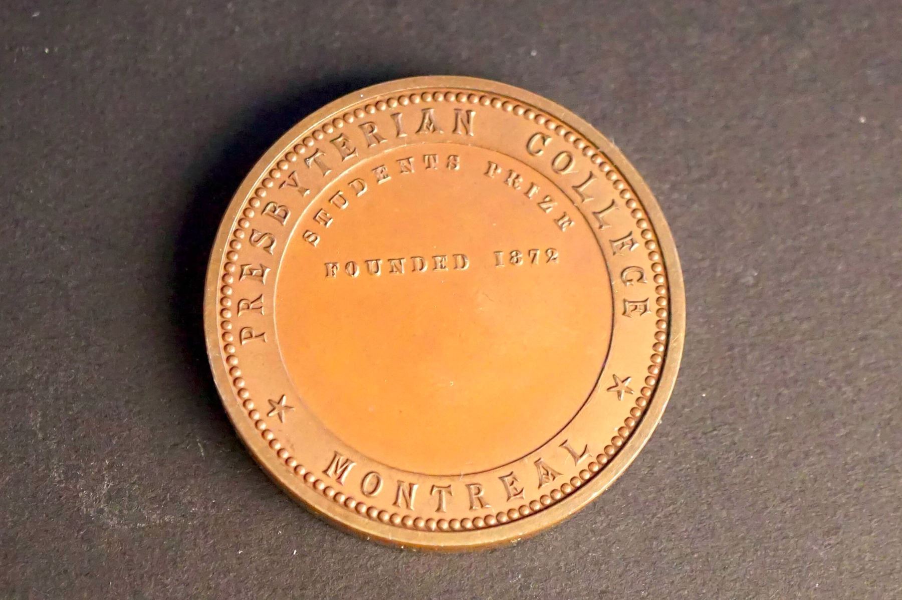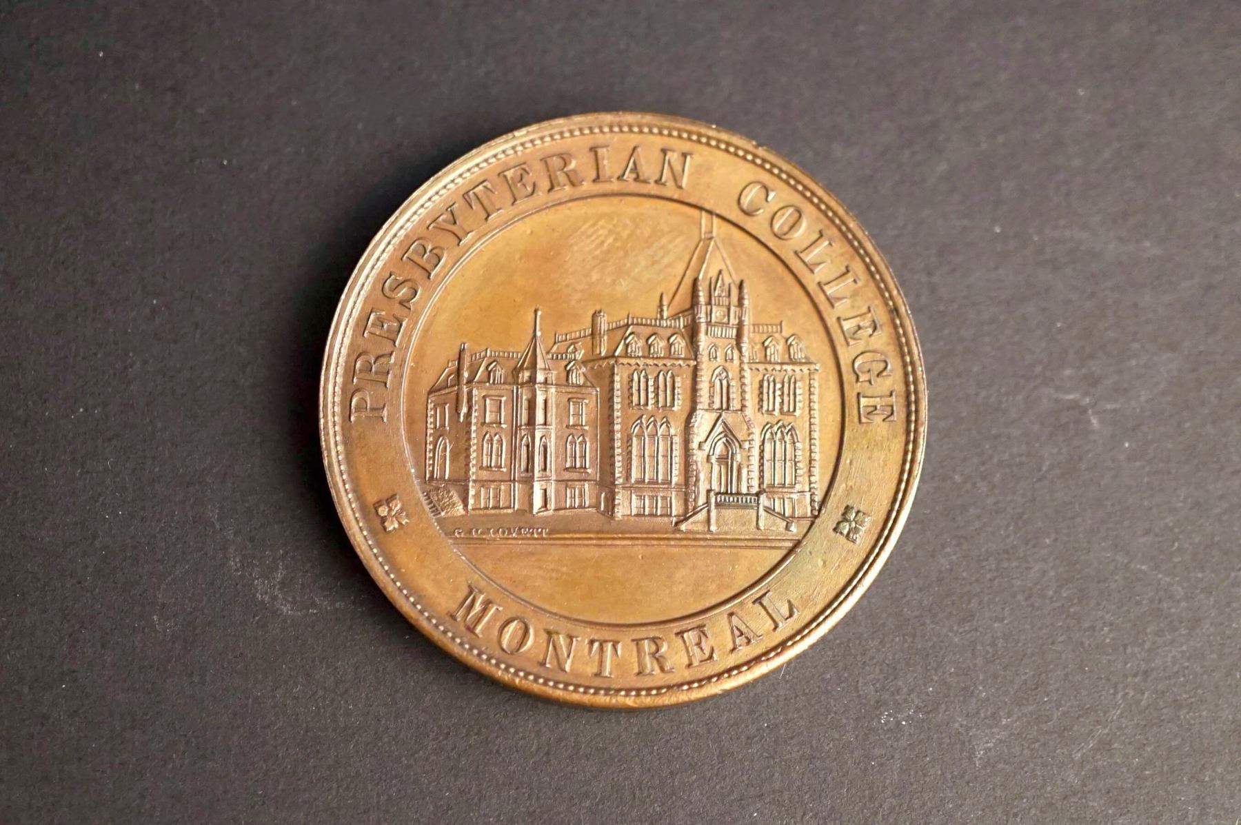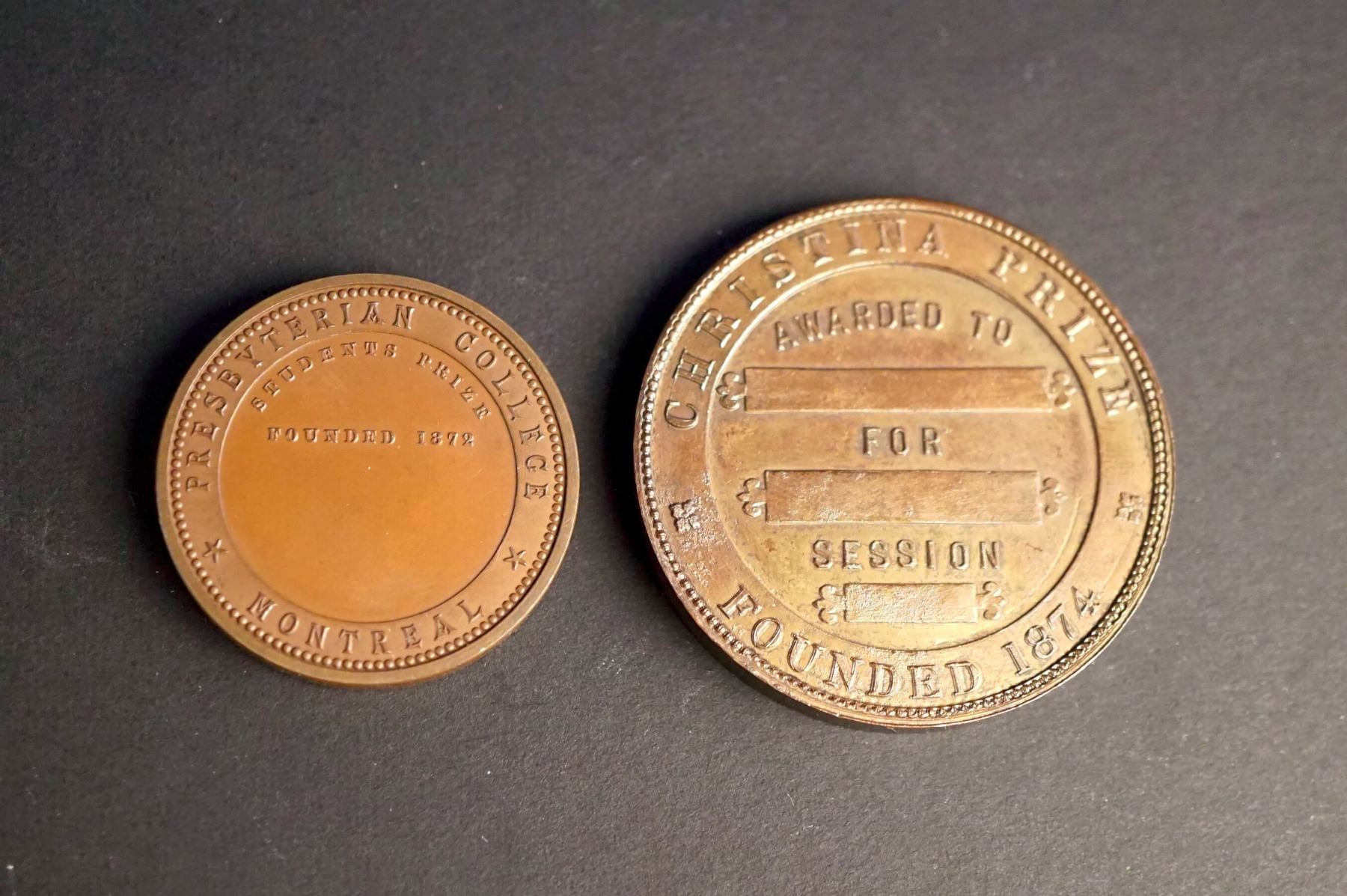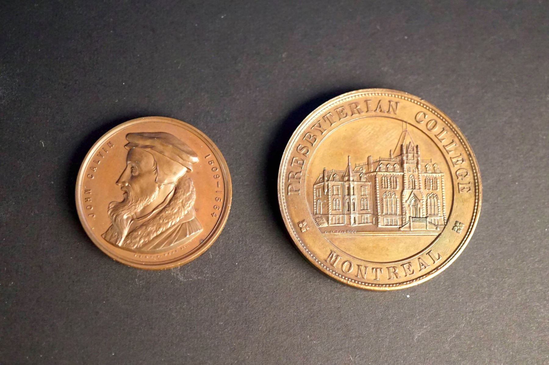 1) Obverse: PRESBYTERIAN COLLEGE - Montréal College building at canter. Signed: G. W. LOVETT. Revere: CHRISTINA PRIZE FOUNDED 1874 around. At center: Awarded to ------for ----- Session ---- Bronze 54 mm, 49.9 gram. AU condition. 2) Copper, 34 mm, 27.6 grams. In glossy Choice UNC or Proof condition. Obverse: JOHN CALVIN 1509 - 1564 Bust of Calvin, left. Signed: J. S. & A. B. WYON. Reverse: PRESBYTERIAN COLLEGE Montréal. In center circle, at top: Students Prize / Founded 1872 Lower part of central circle blank, for engraving.