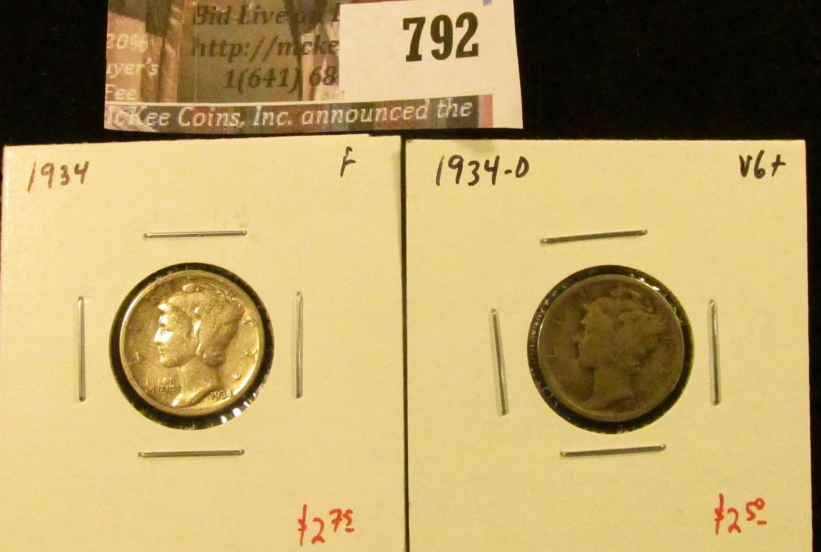 (2) Mercury Dimes, 1934 F, 1934-D VG+, value for pair $5+