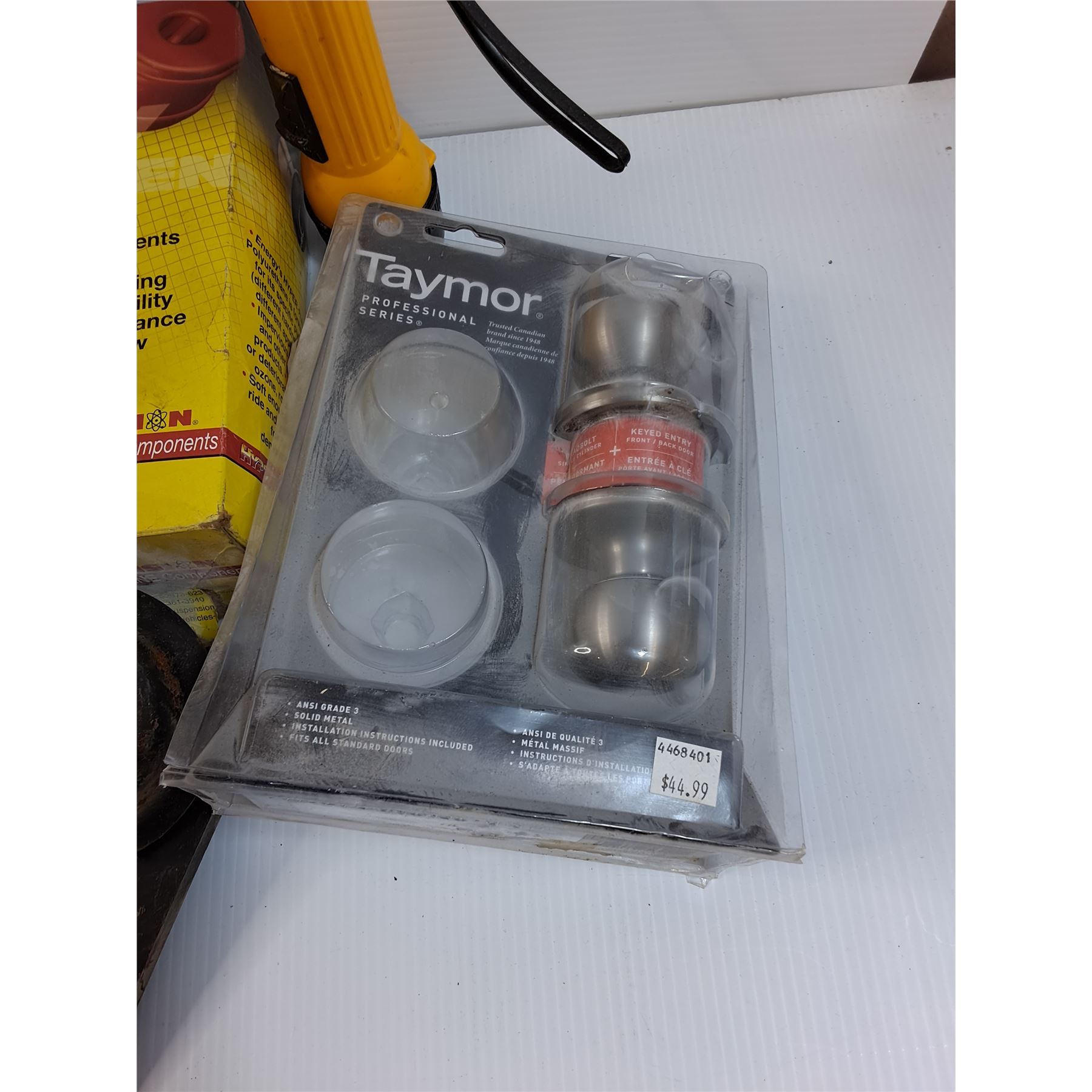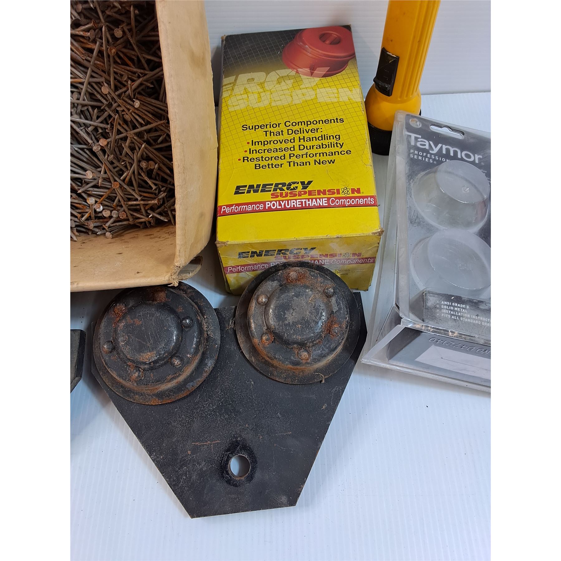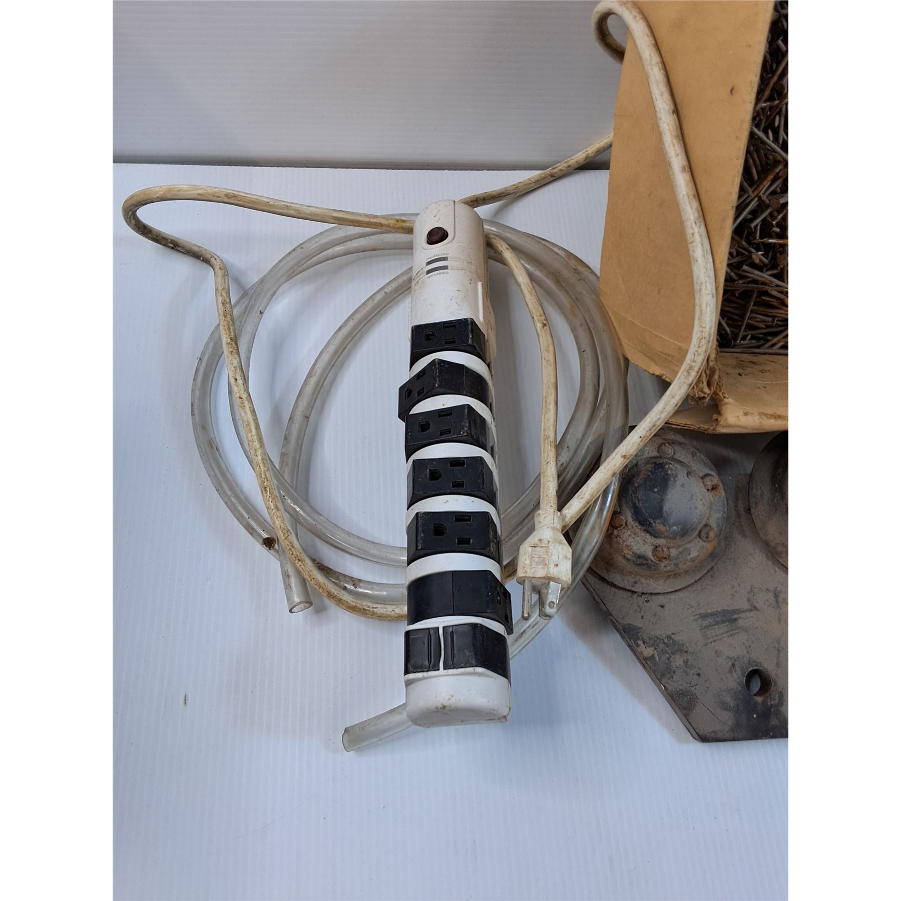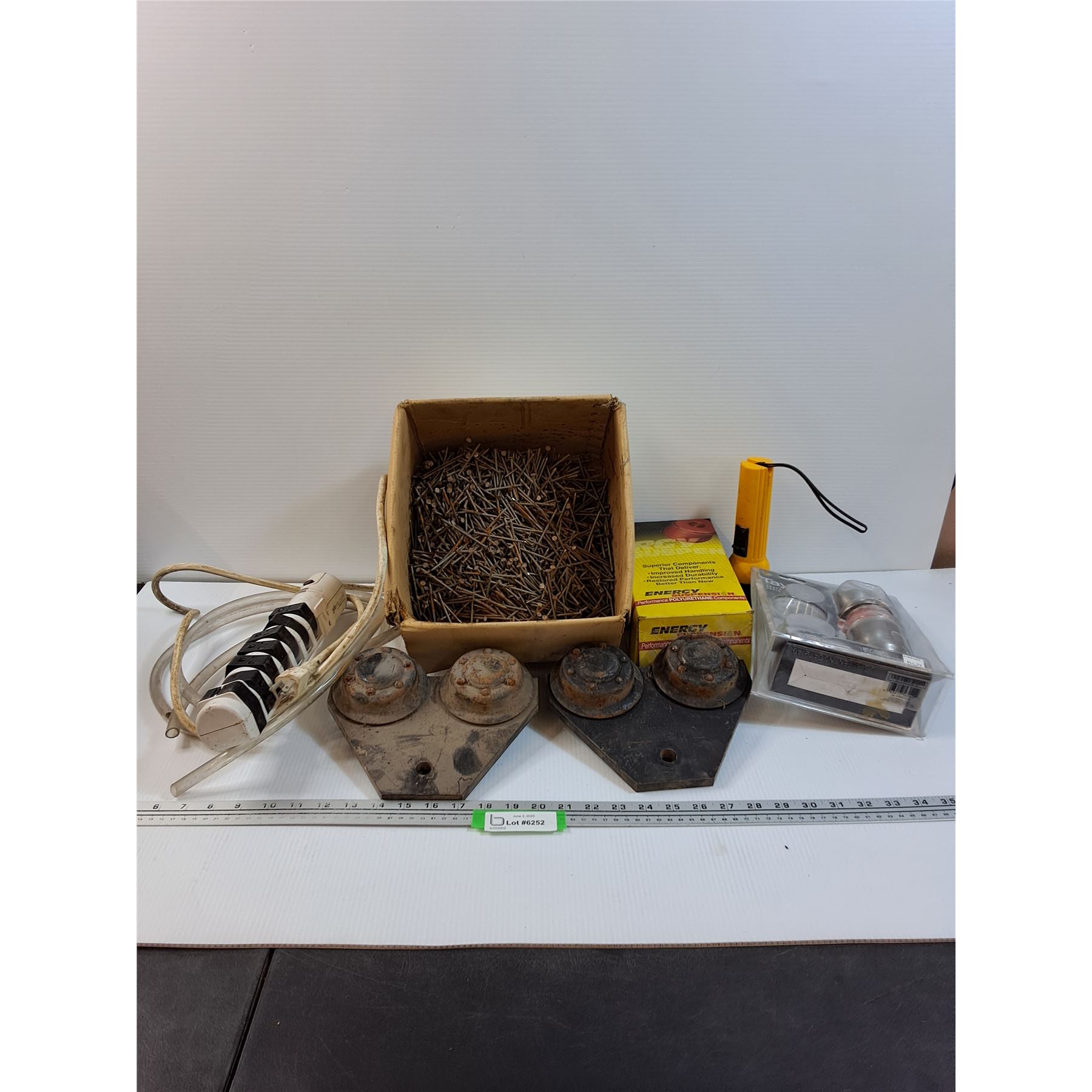 (2) Metal Beam Trolleys, Suspension Poly Components, Door Knob, Nails in Box, Power Bar, As Is