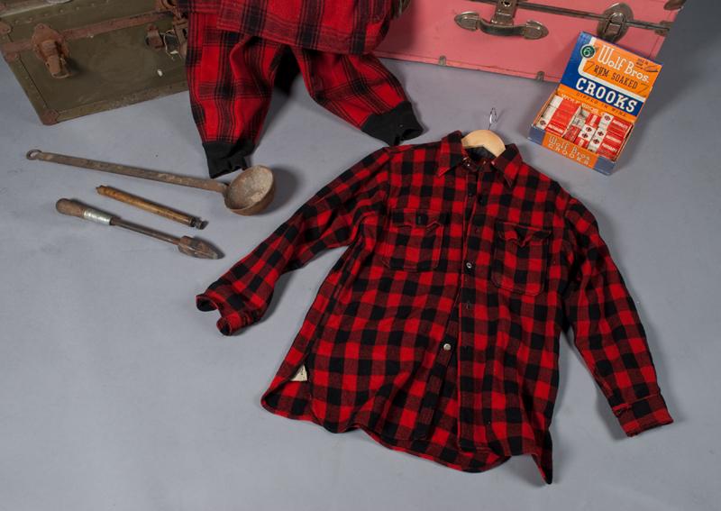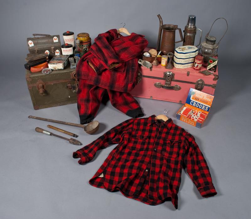 A very nice grouping to include a Hiram L. Piper Co. metal and glass lantern, a Brookins 1/2 gallon oil can, a early mailbox form lunch box, several advertising tins, a souvenier canoe from Bay City, MI, an electric marking pencil in original box, an early hand forged iron dipper, various lighters, cloisonne match holder CHINA, an early black and red wool hunting outfit, and various other items.