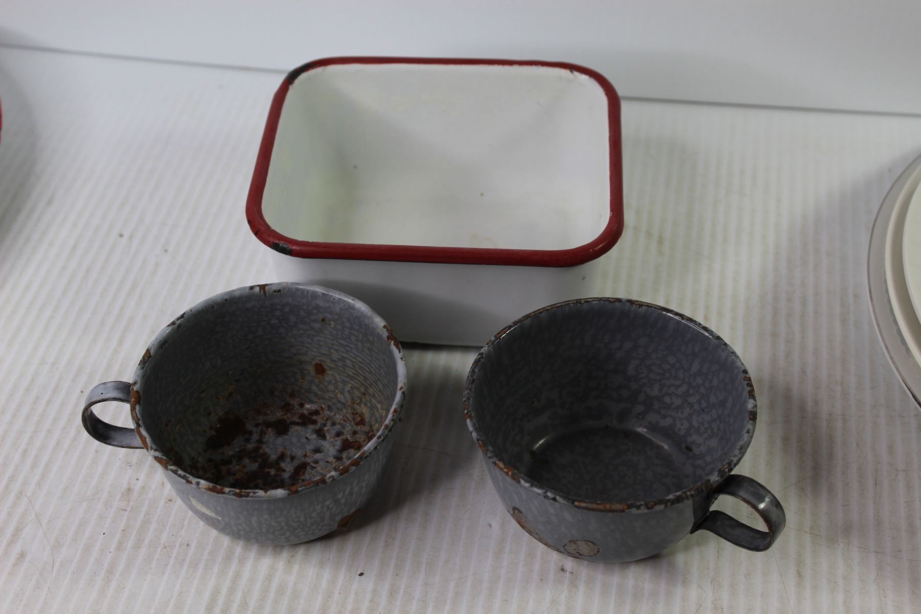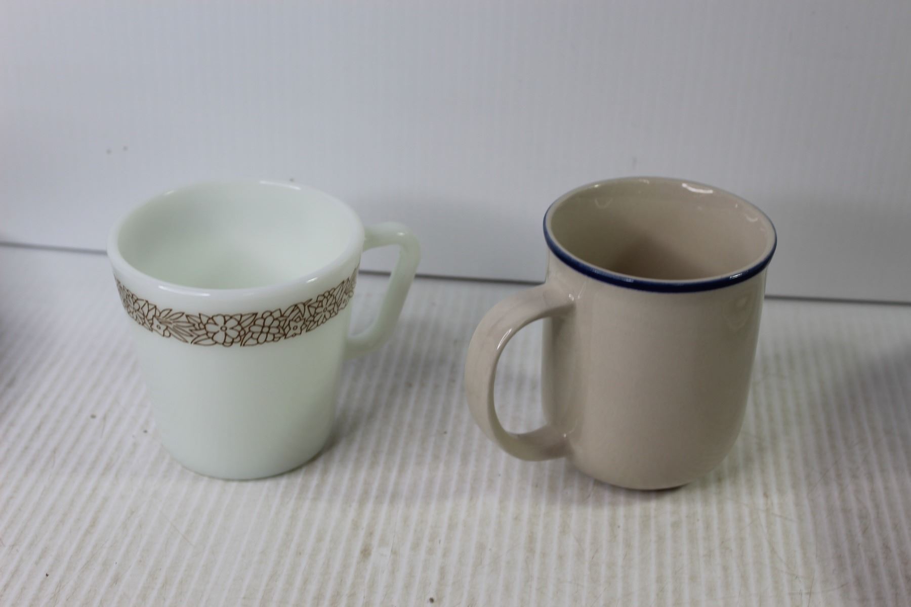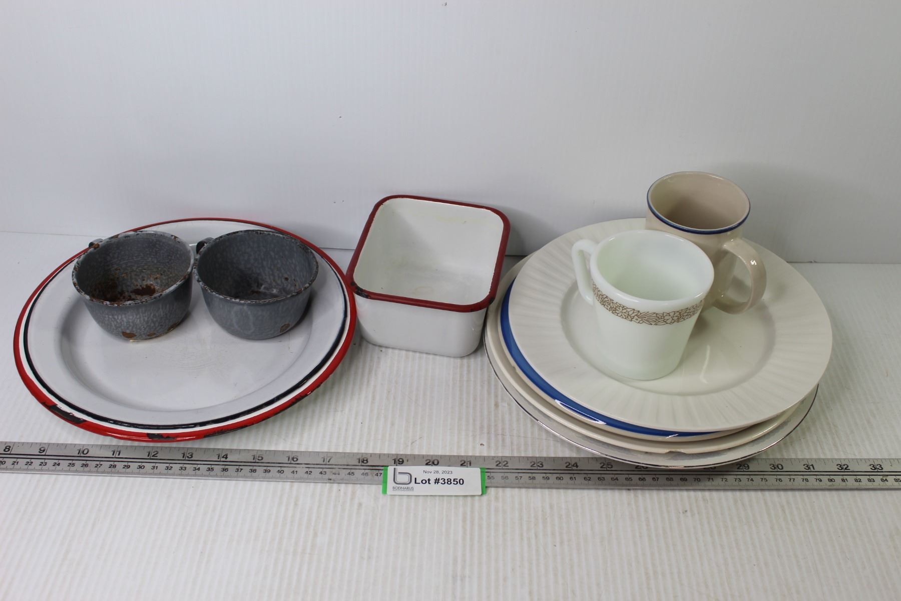 (2) Metal Plates - Plates - (2) Tin Cups - (2) Mugs (one is Pyrex)