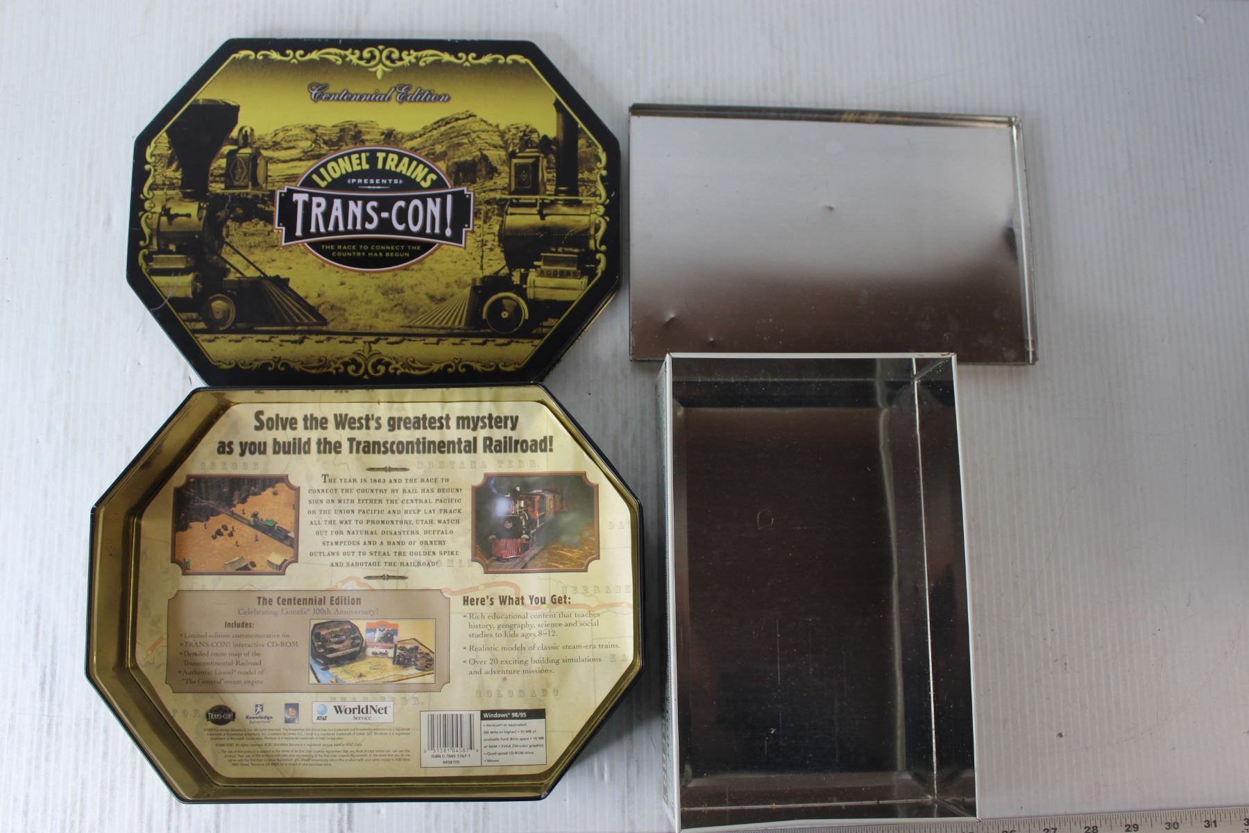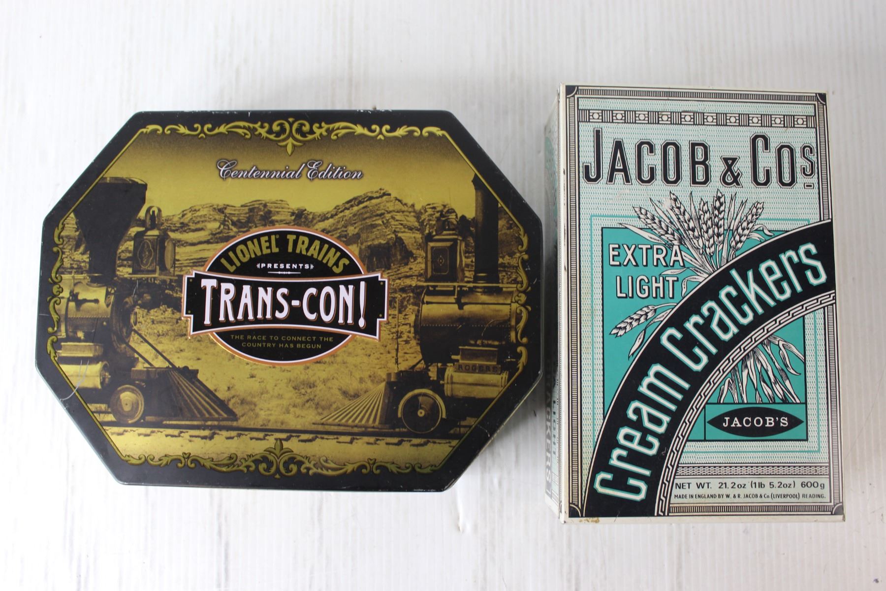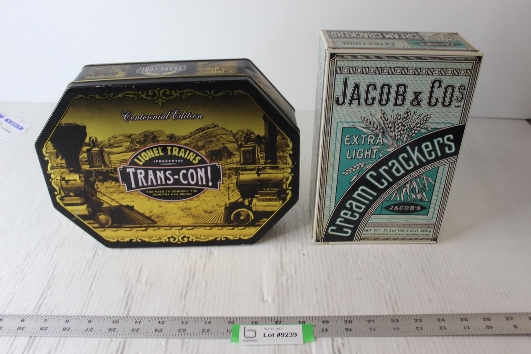 (2) Metal Tins - Lionel Trains Trans-Con! Centennial Edition, Jacob & Cos. Extra Light Cream Crackers