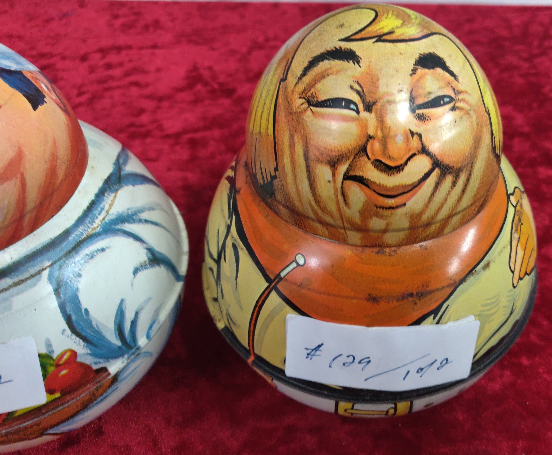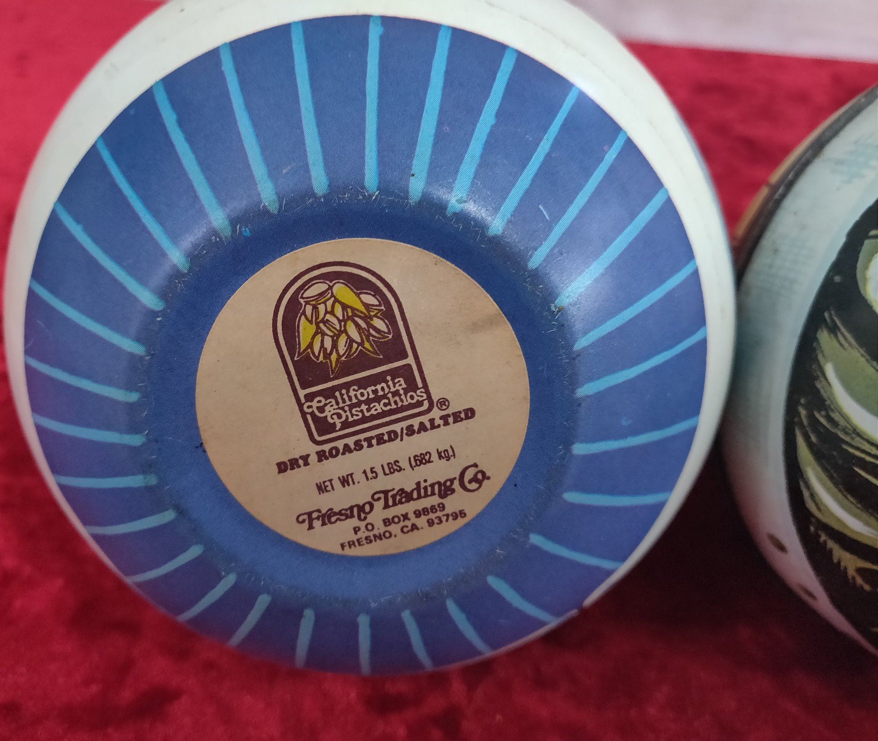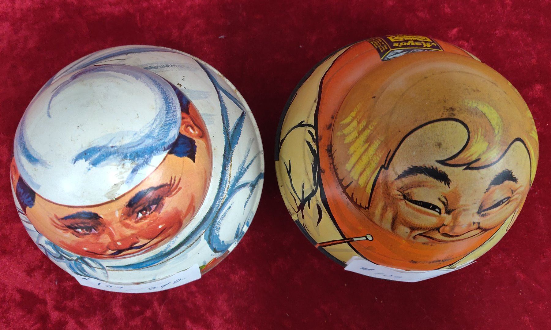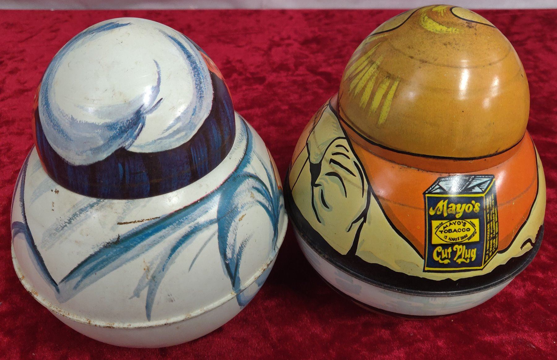 2 Metal Tobacco Containers, c. 1950s. Made of tin and paint, the item measure approx. 7" x 6" each. China. Condition: Good, some wear, see images. Shipping: $17.50 w/insurance and signature.