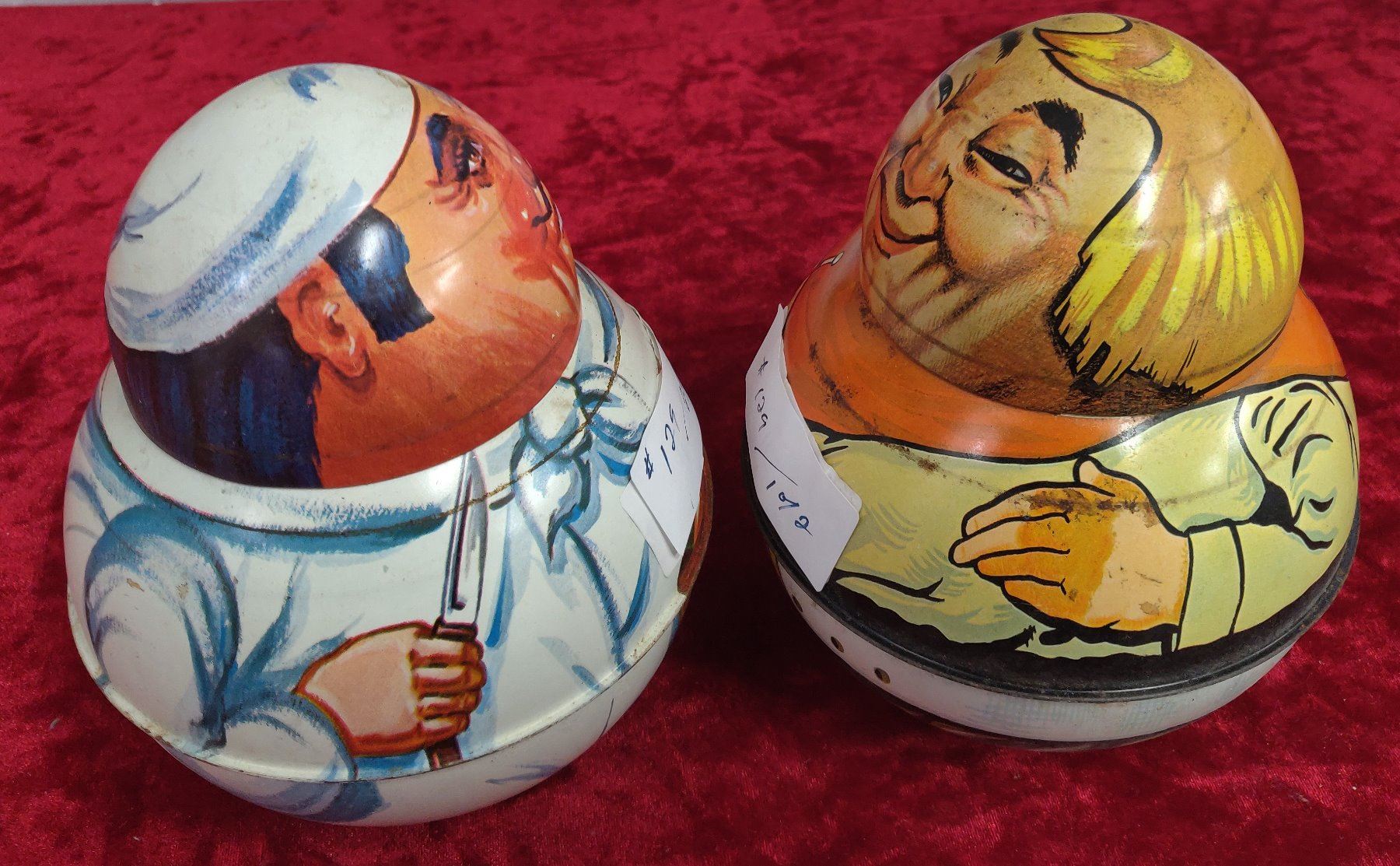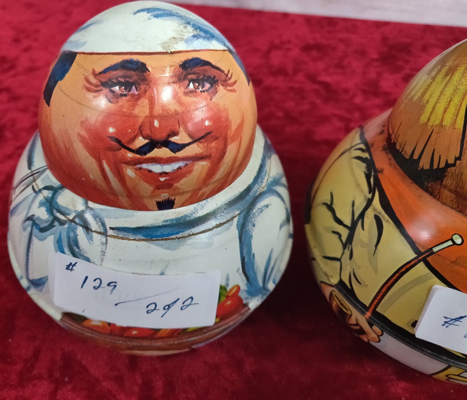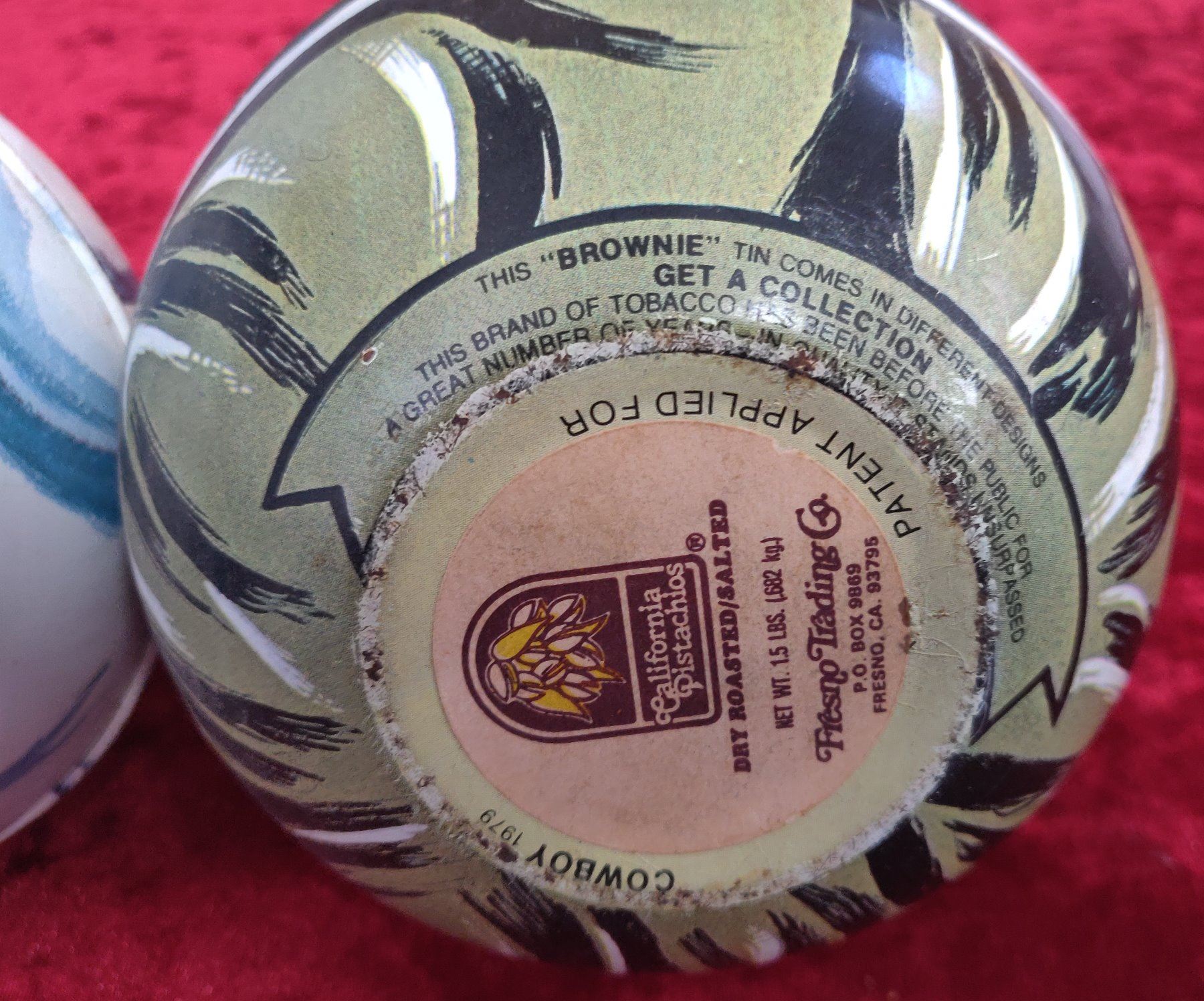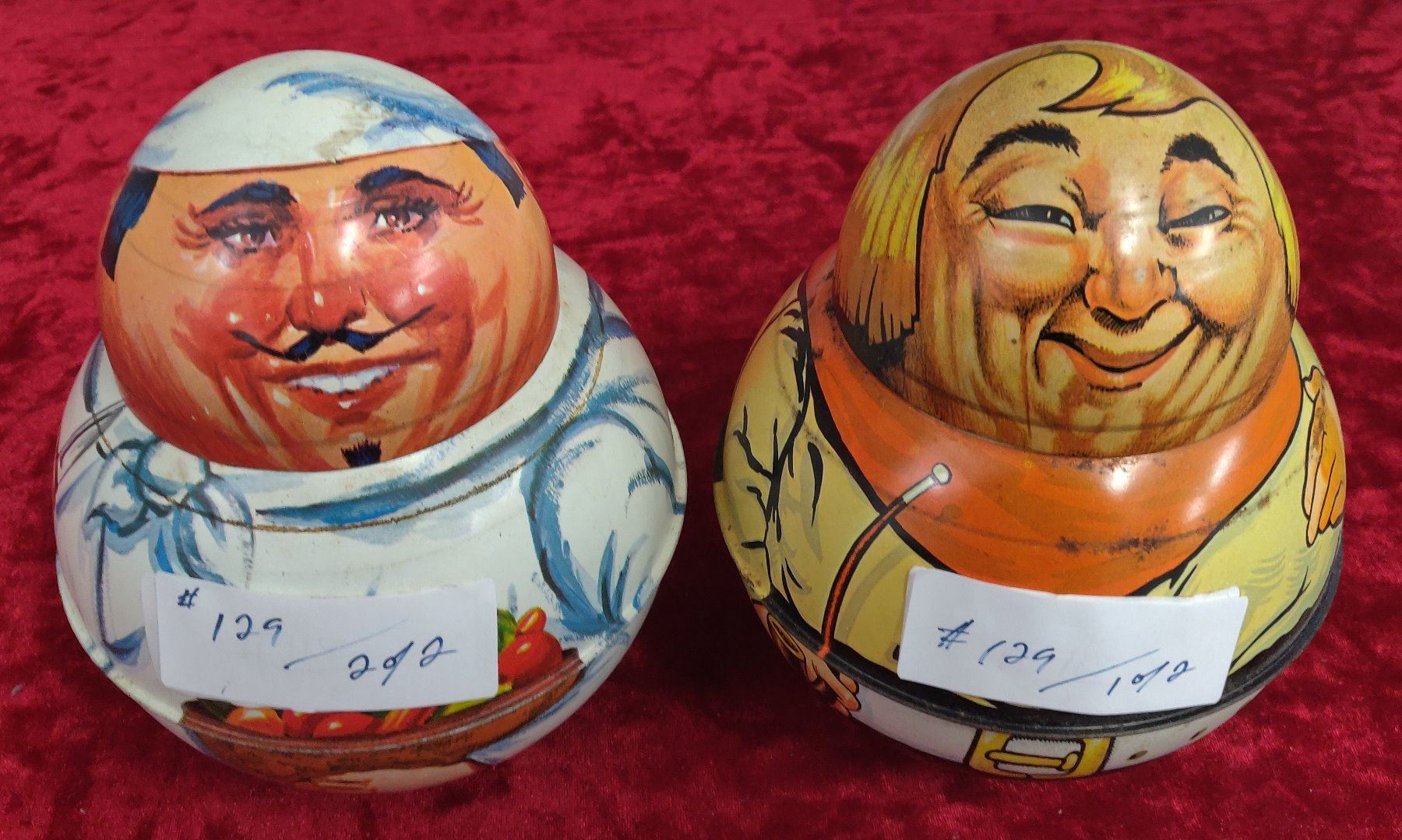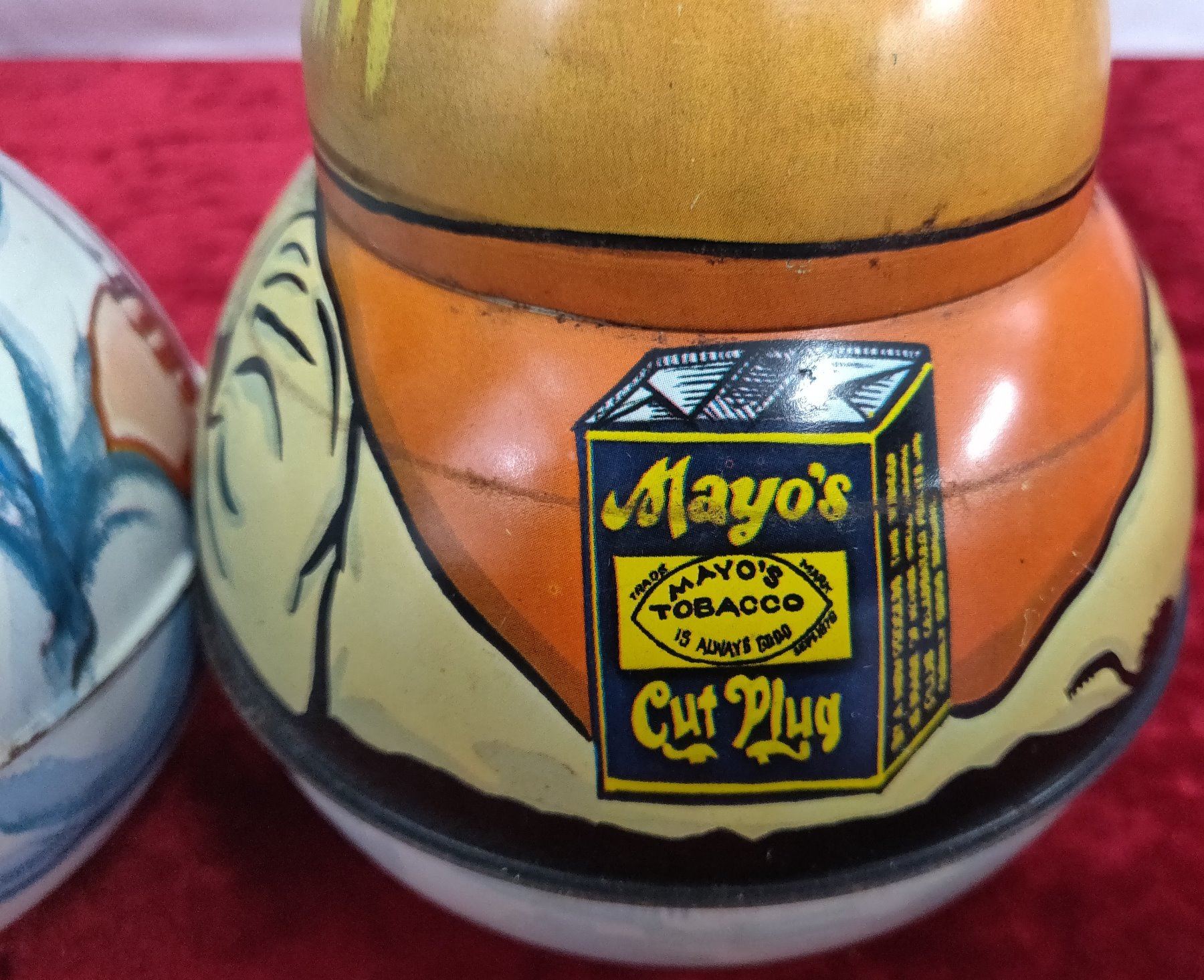 2 Metal Tobacco Containers, c. 1950s. Made of tin and paint, the item measure approx. 7" x 6" each. China. Condition: Good, some wear, see images. Shipping: $17.50 w/insurance and signature.