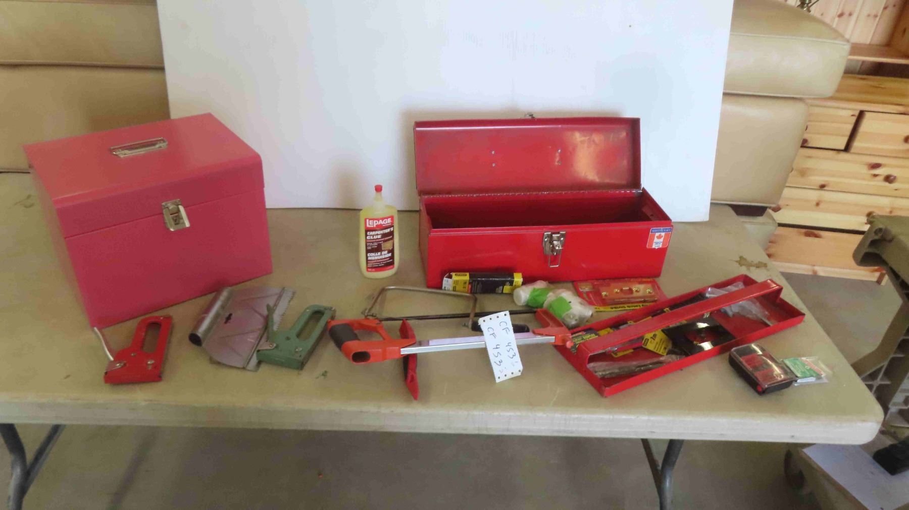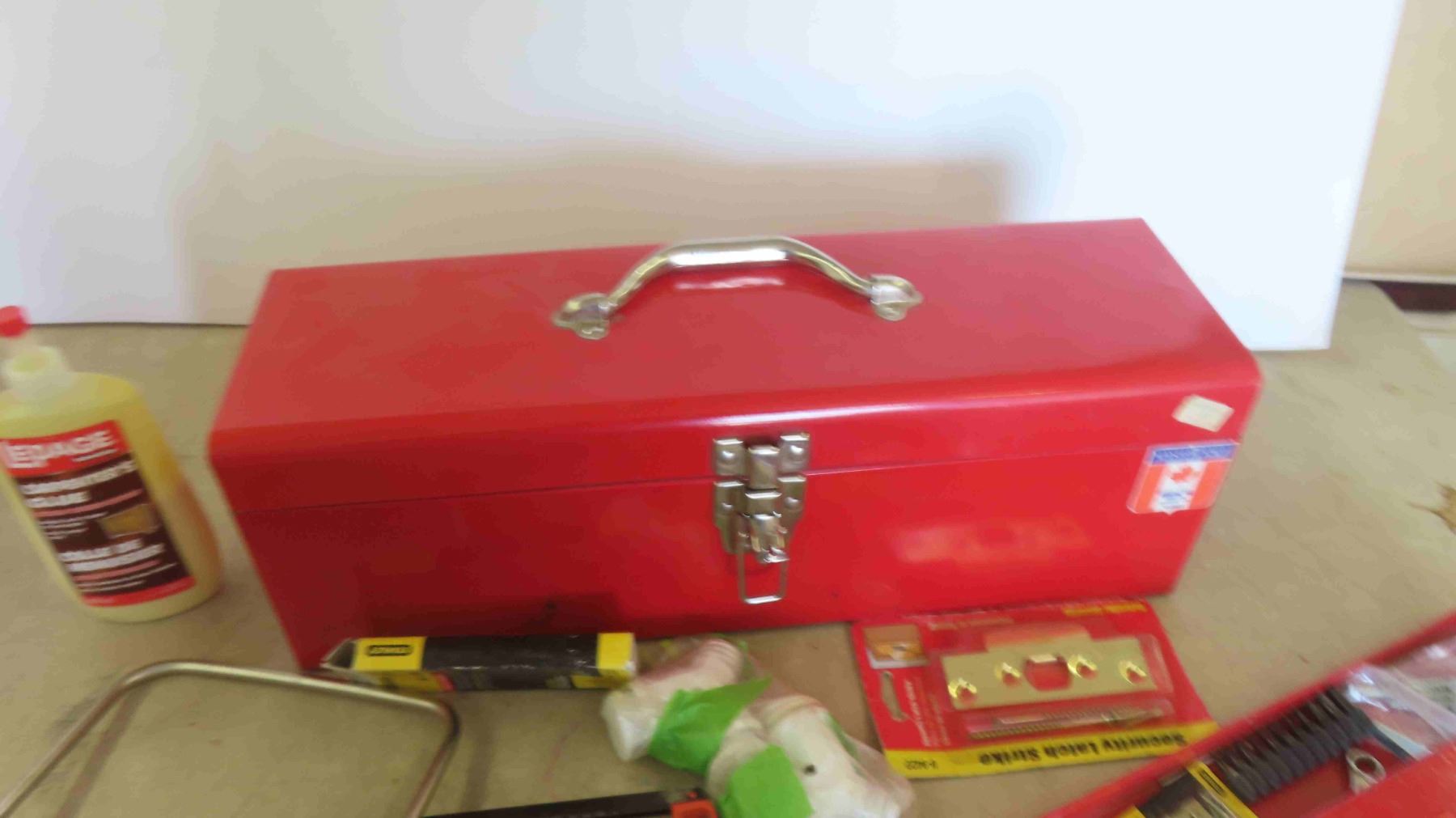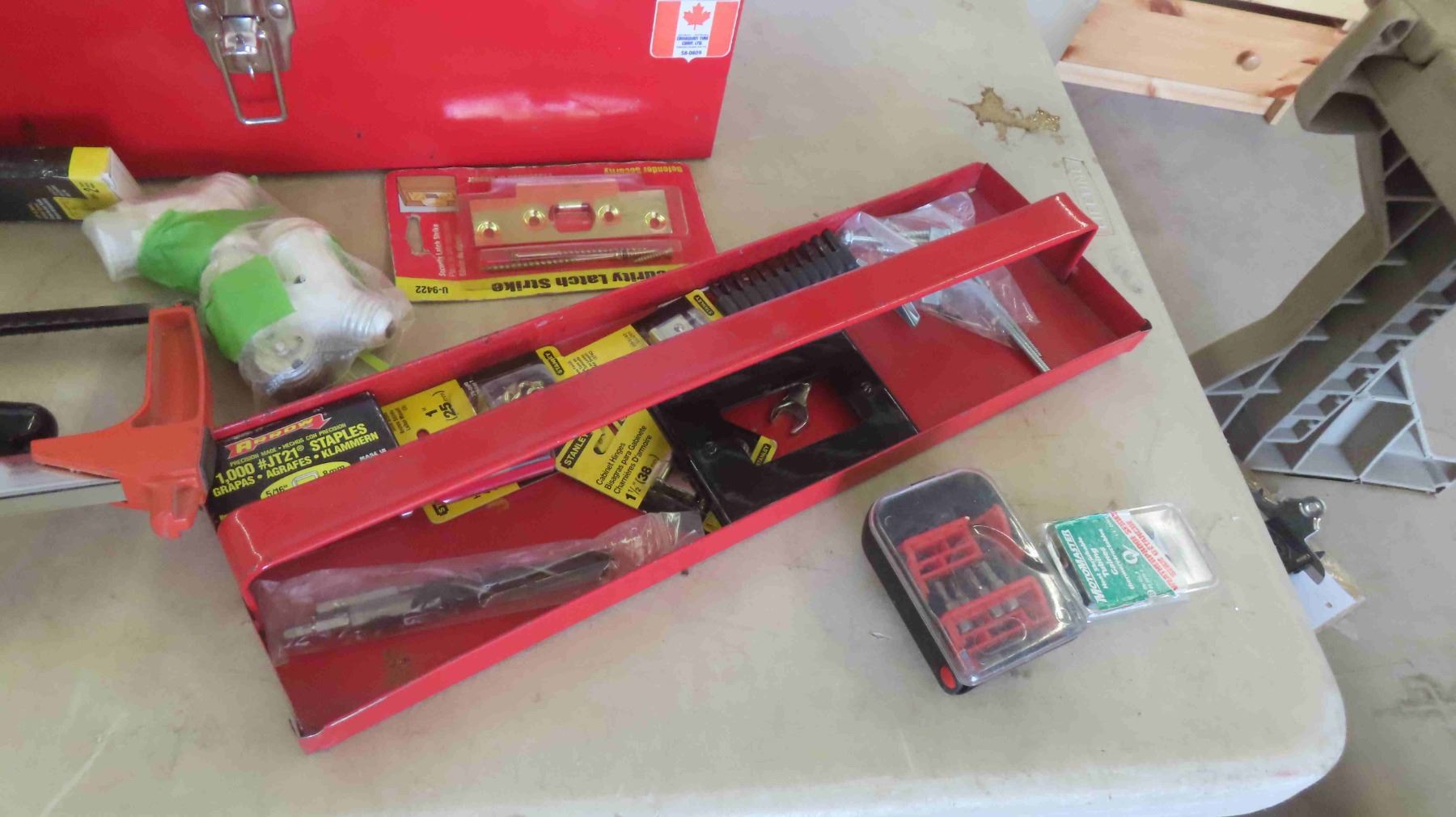 2 Metal Tool Boxes with Some Hardware and Odds Tools: Screw Bits, Hack Saw, Staples, Hinges & More