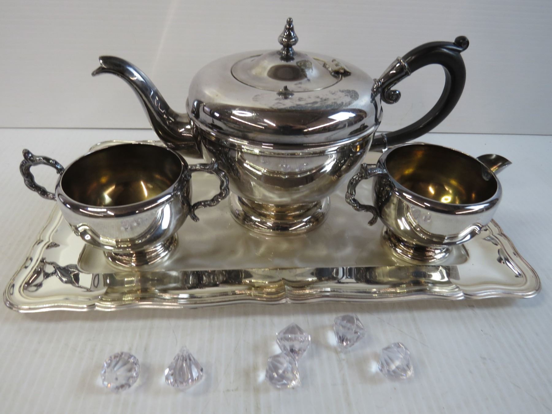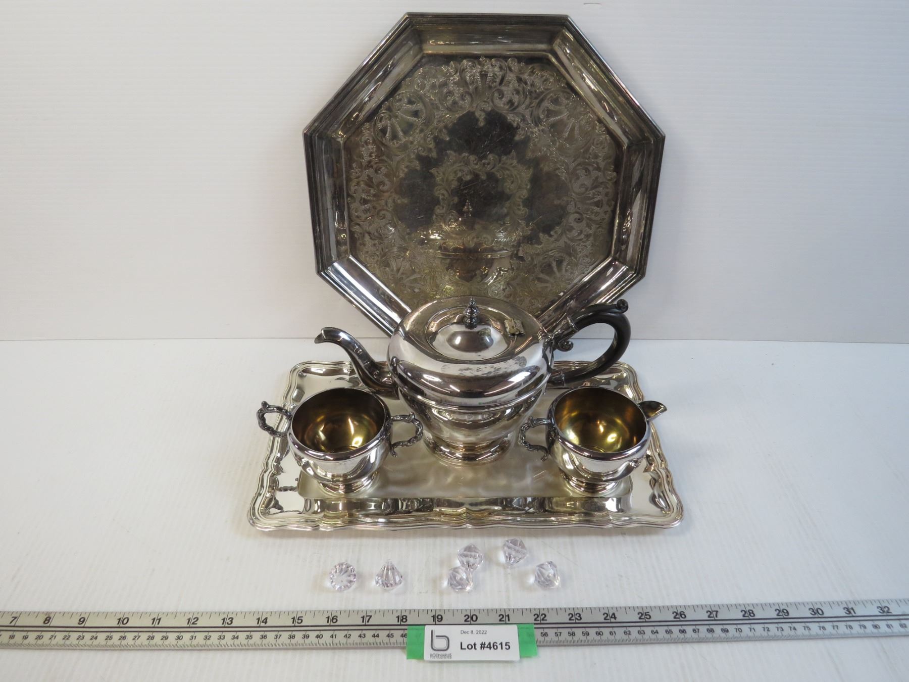 (2) Metal Trays - Tea Pot - Cream & Sugar Containers