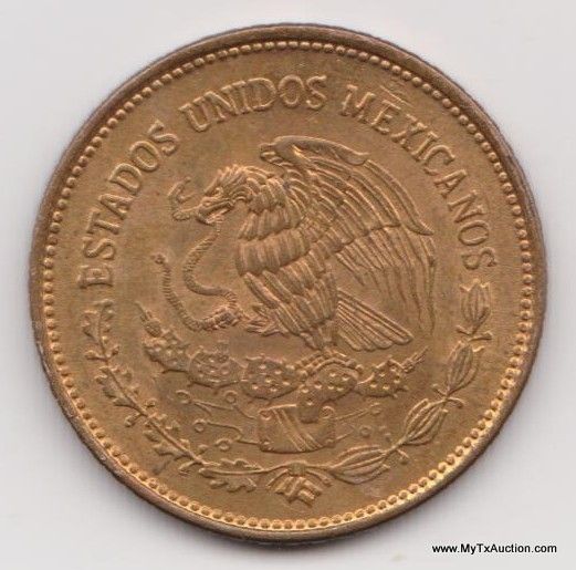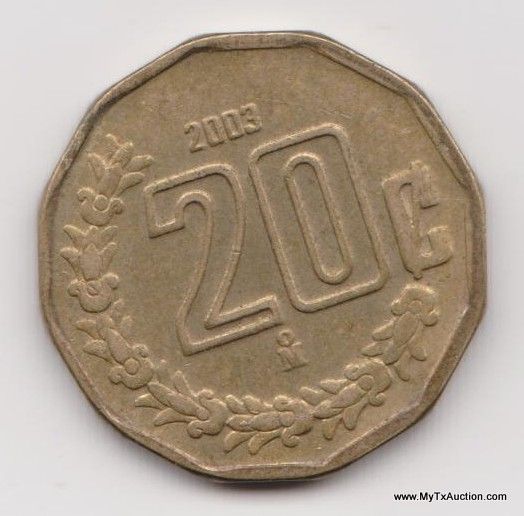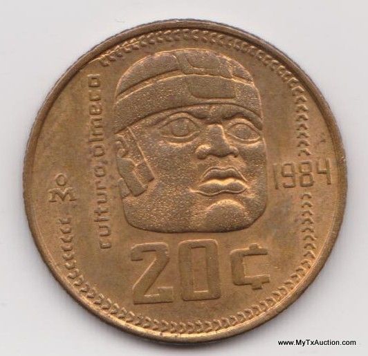 1-1984 20 Centavos Country:Mexico - Coin Mint Years:1983-1984 - Metal:Bronze - Weight:3g - Diameter:20mm - Thickness:1.1mm - Design Obverse:National arms - eagle left, with snake and cactus Lettering: ESTADOS UNIDOS MEXICANOS - Reverse:Mask 3/4 right with value below, date right Lettering:culturo olmeco oM 1984 20c - Engravers:Unknown - Shape:Round - Edge: 1-2003 20 Centavos (large type) Country:Mexico - Coin Mint Years:1992-2009 - Metal:Aluminium-bronze - Weight:3.04g - Diameter:19.5mm - Thickness:1.5mm - Design Obverse:National Arms (Eagle on cactus facing left with snake in beak above wreath), with the inscription forming a semicircle above it Lettering:ESTADOS UNIDOS MEXICANOS - Reverse:In the center of the coin, the number twenty "20" as the key motif and denoting face value; to its right the cent symbol "¢"; top center, the mint year and to the right, the symbol of the Mint of Mexico "M"; to the left, parallel to 12-sided frame, a stylized image of the Acatl Day of the Aztec "Piedra del Sol"