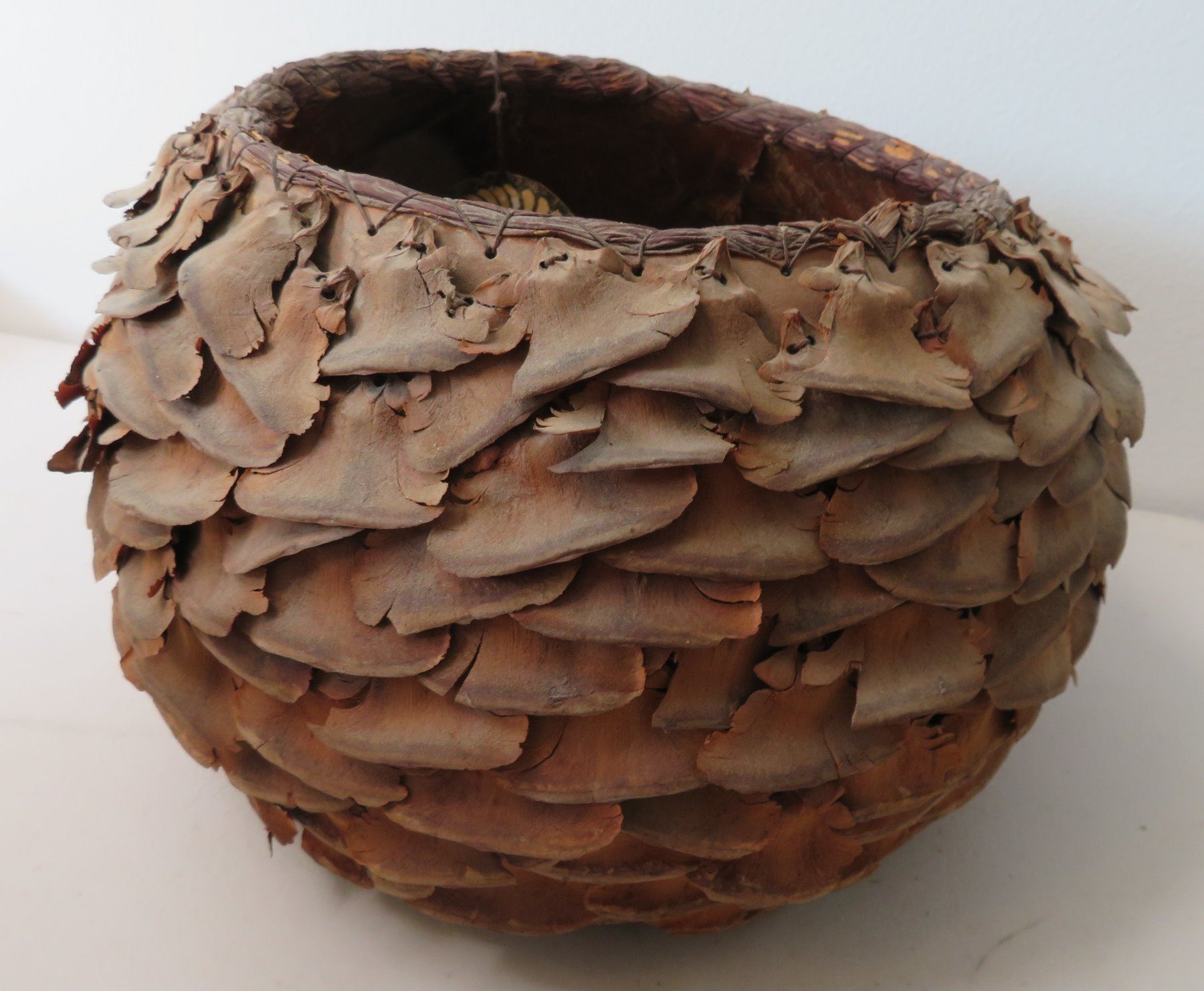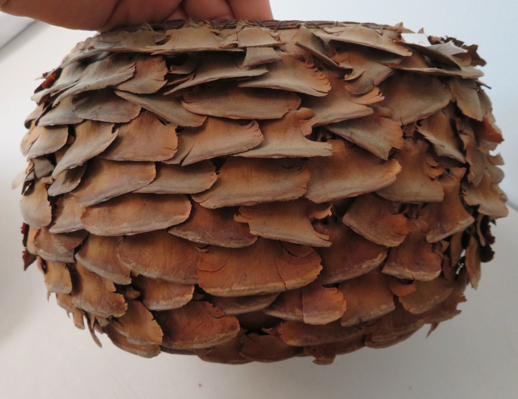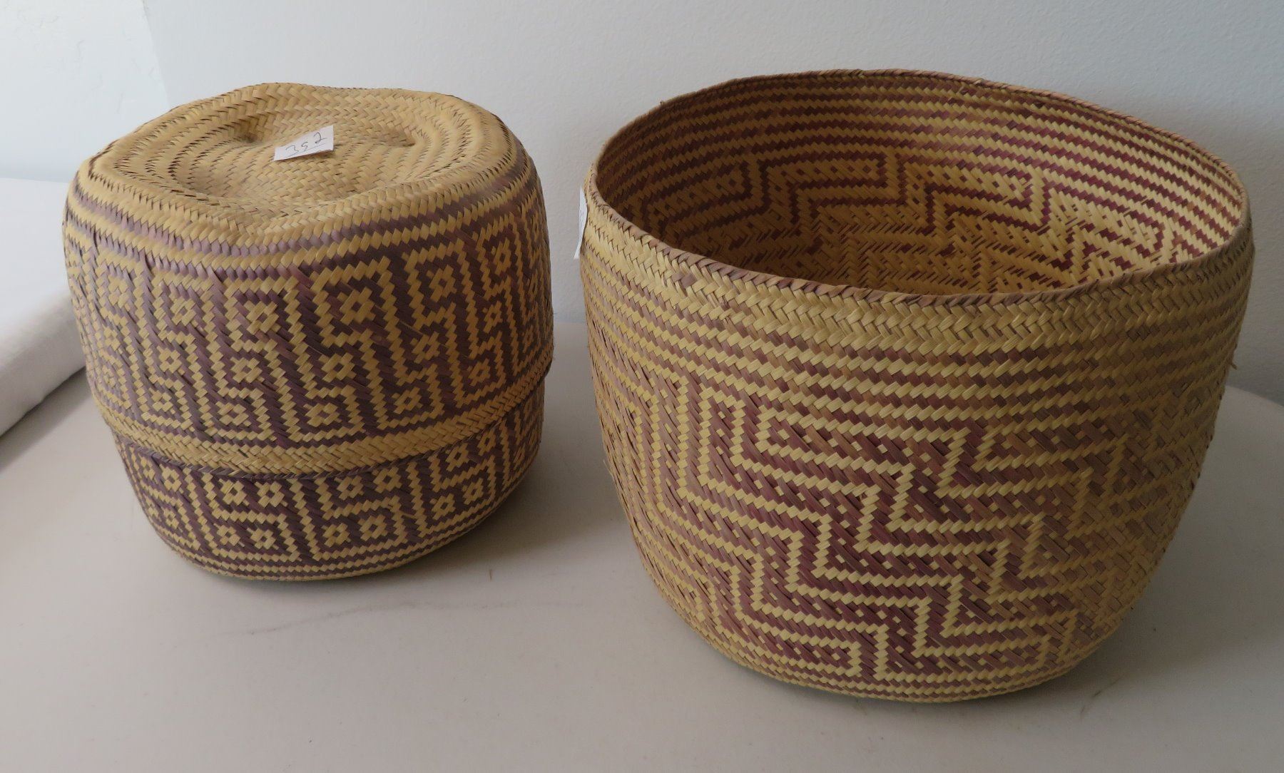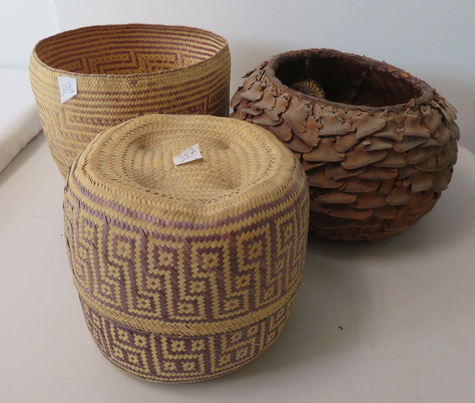 2 Mexican Baskets, c. 1940s. Made of grass, gourd and pine cones, the largest measures 10" x 7". Central Mexico, USA. One is not native. Condition: Sun faded, see images. Shipping: $32.50 w/insurance and signature, due to size.
