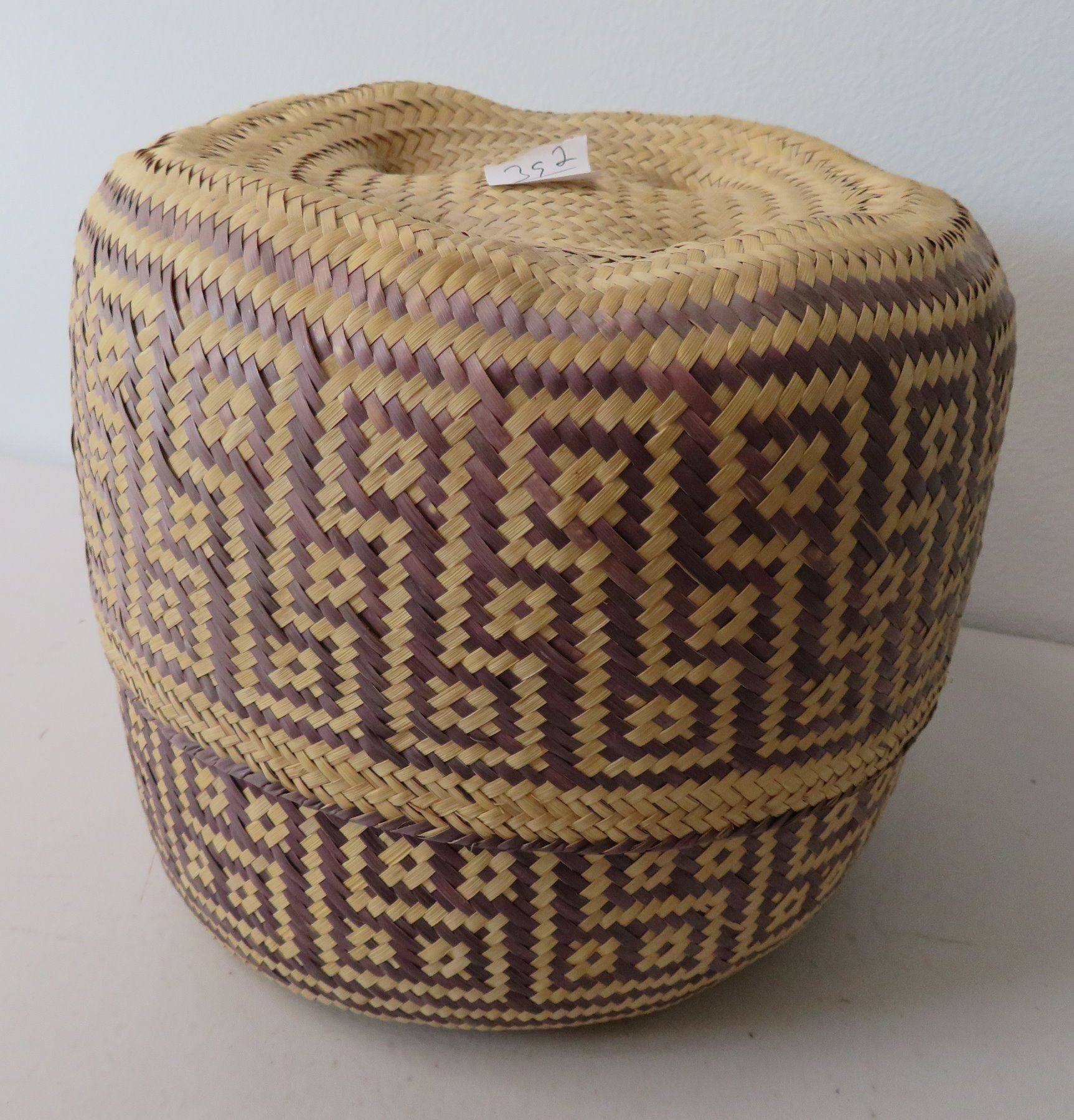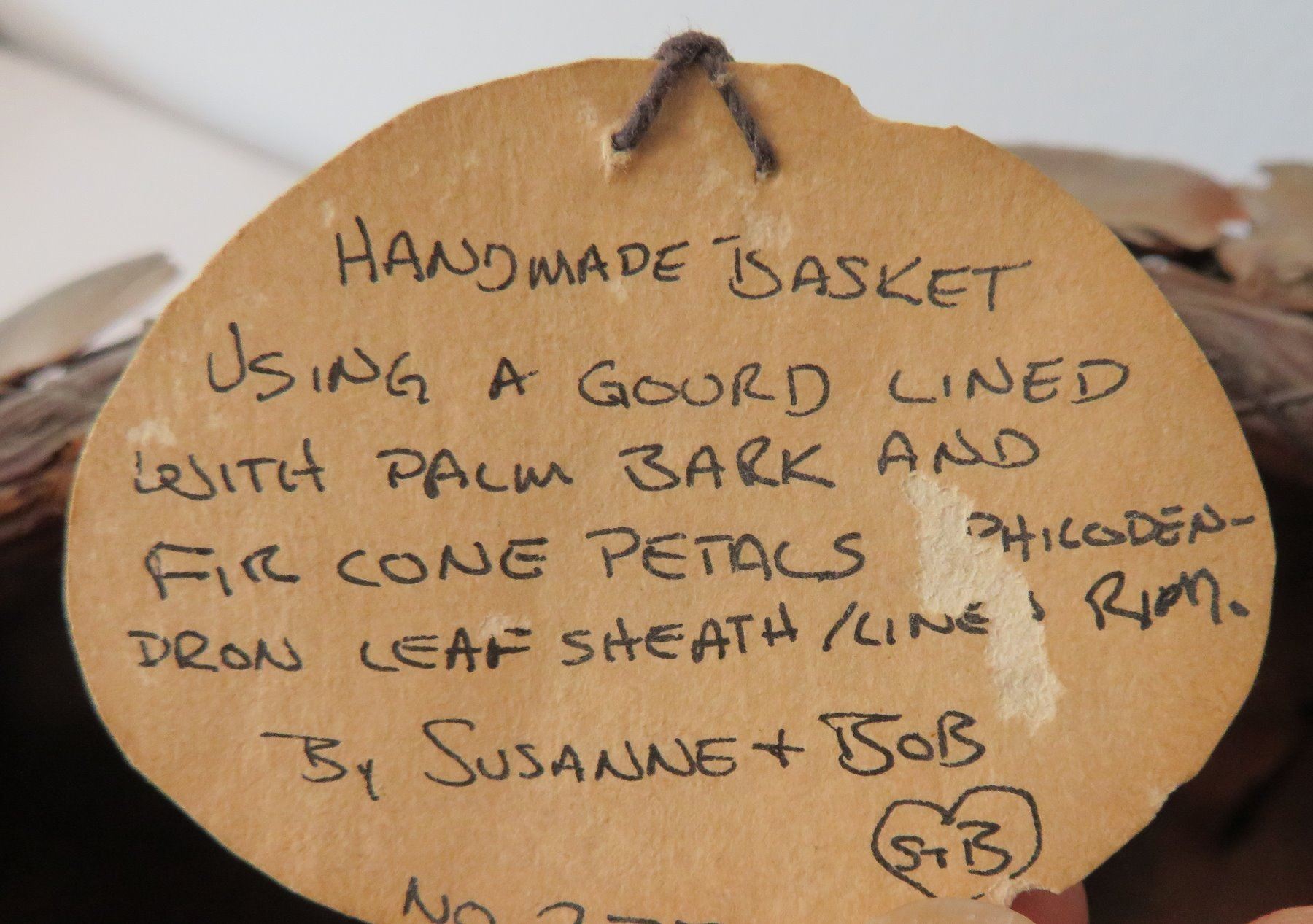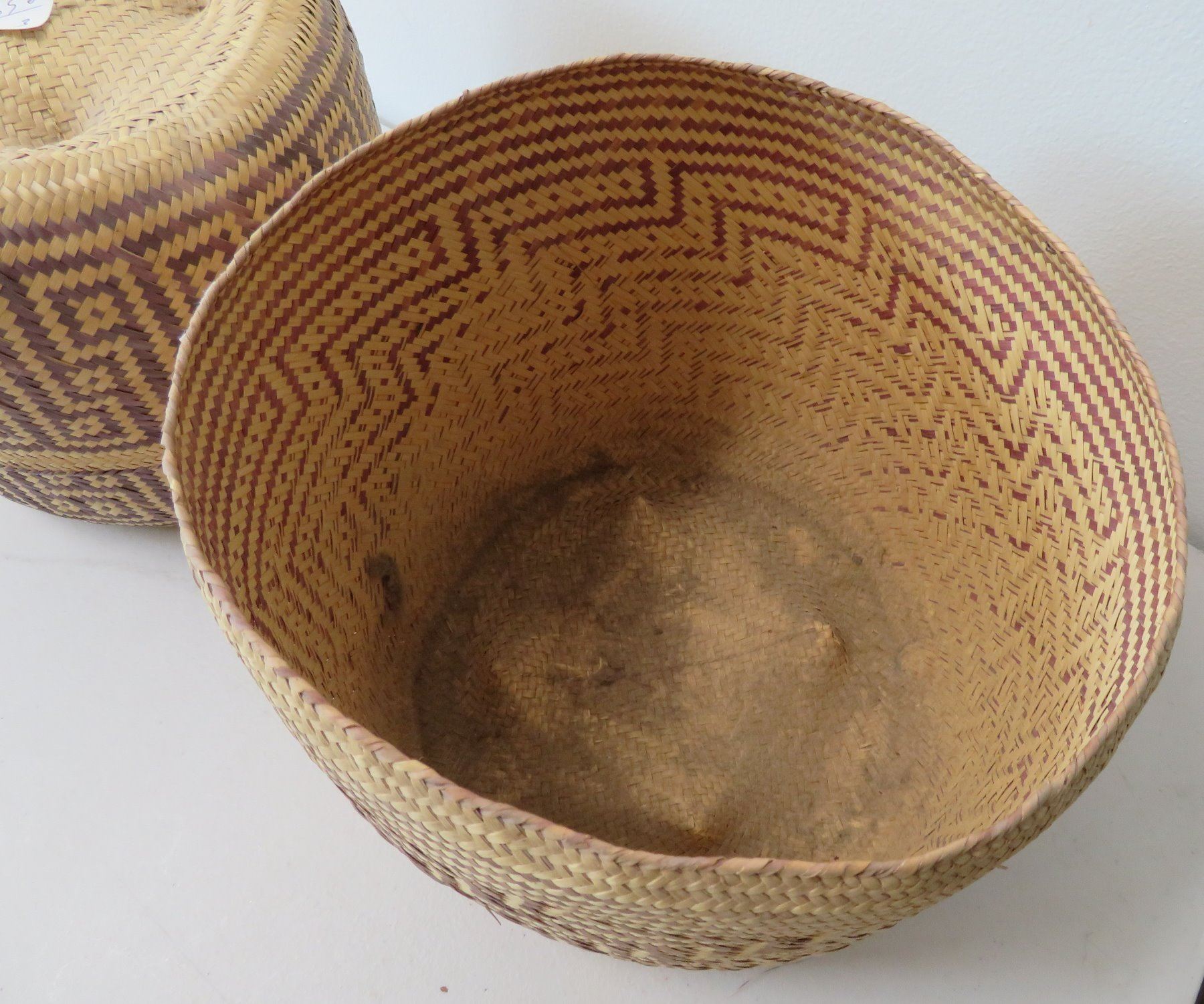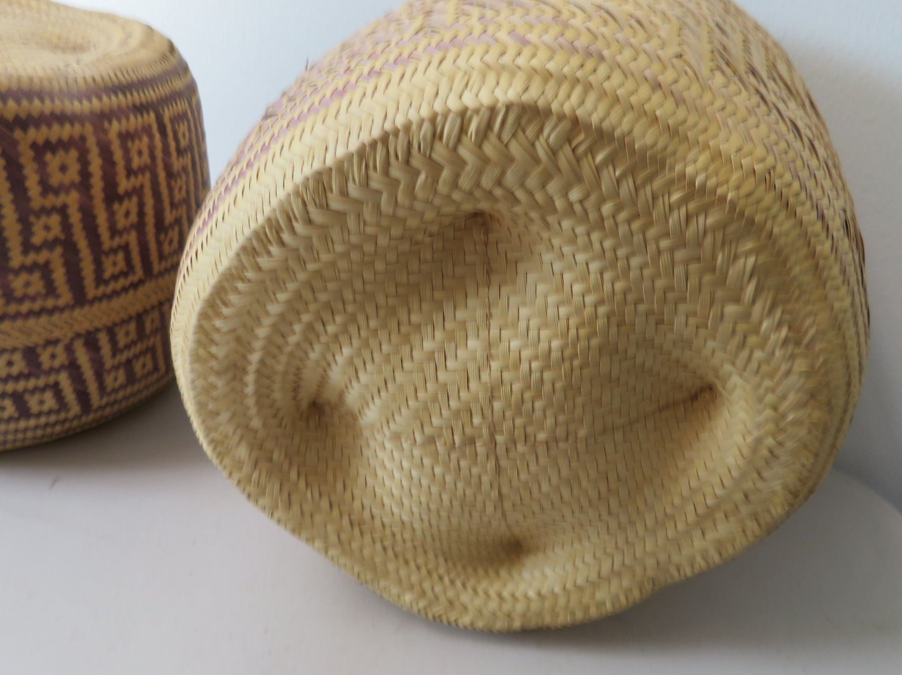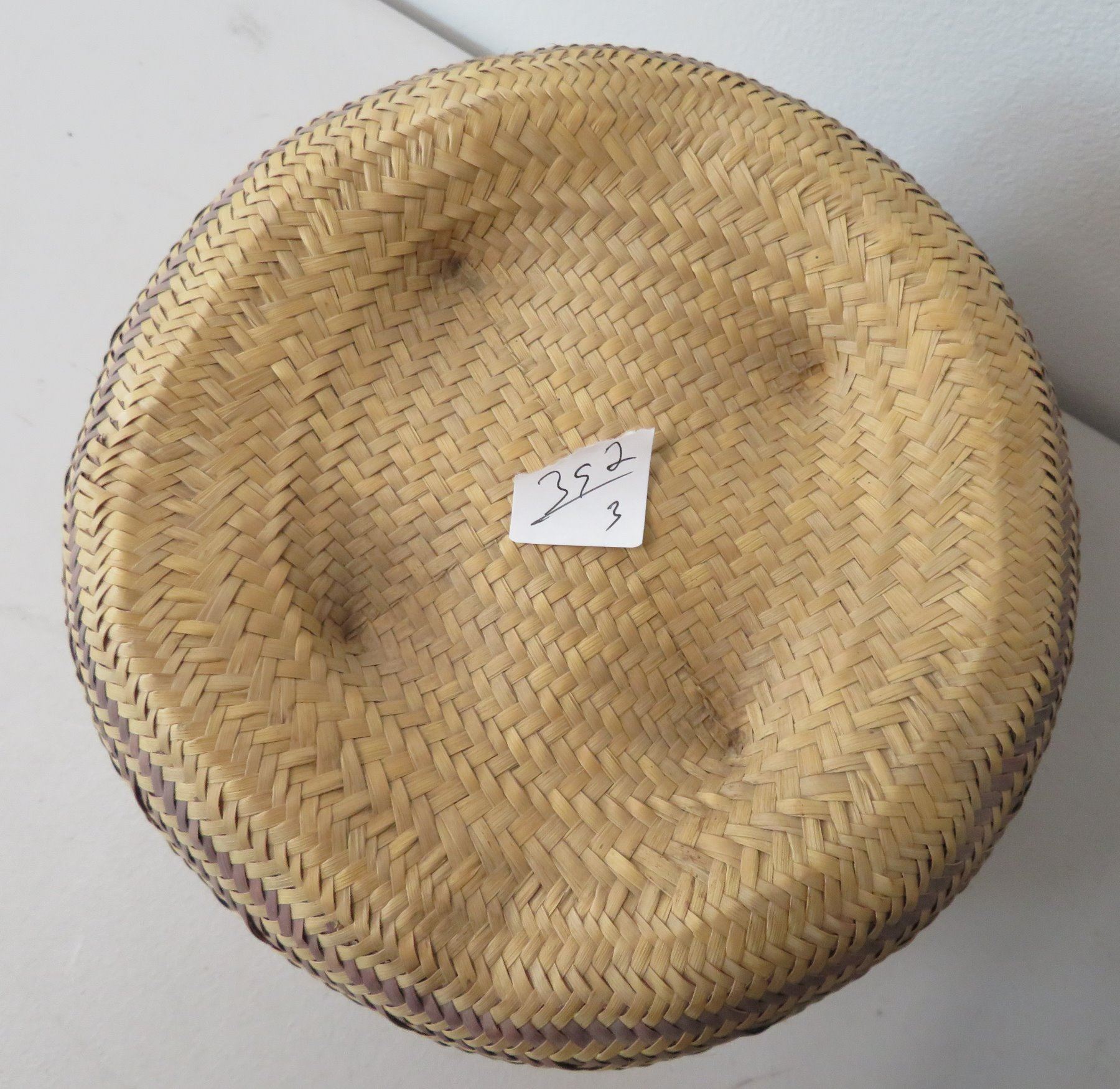 2 Mexican Baskets, c. 1940s. Made of grass, gourd and pine cones, the largest measures 10" x 7". Central Mexico, USA. One is not native. Condition: Sun faded, see images. Shipping: $32.50 w/insurance and signature, due to size.