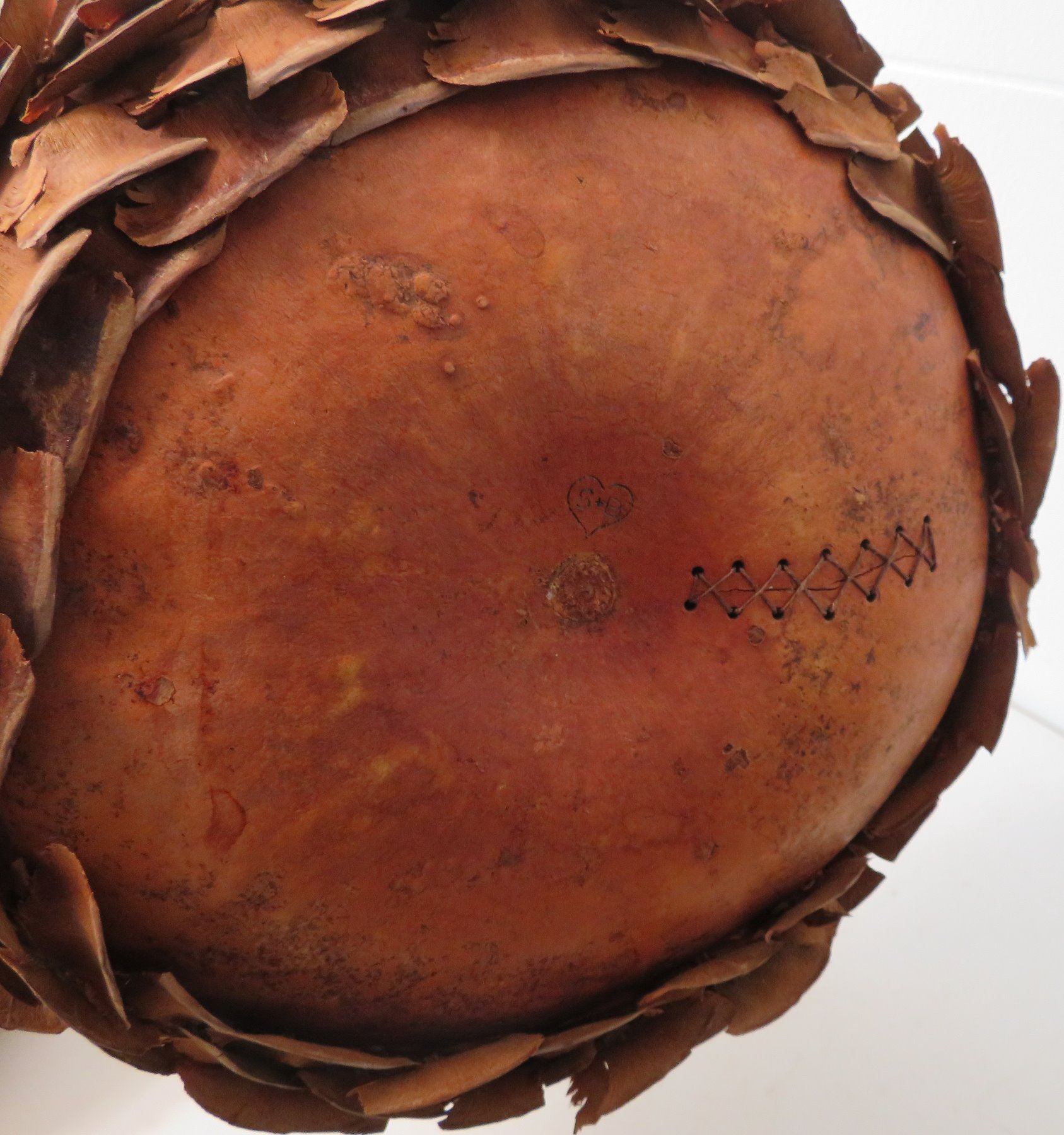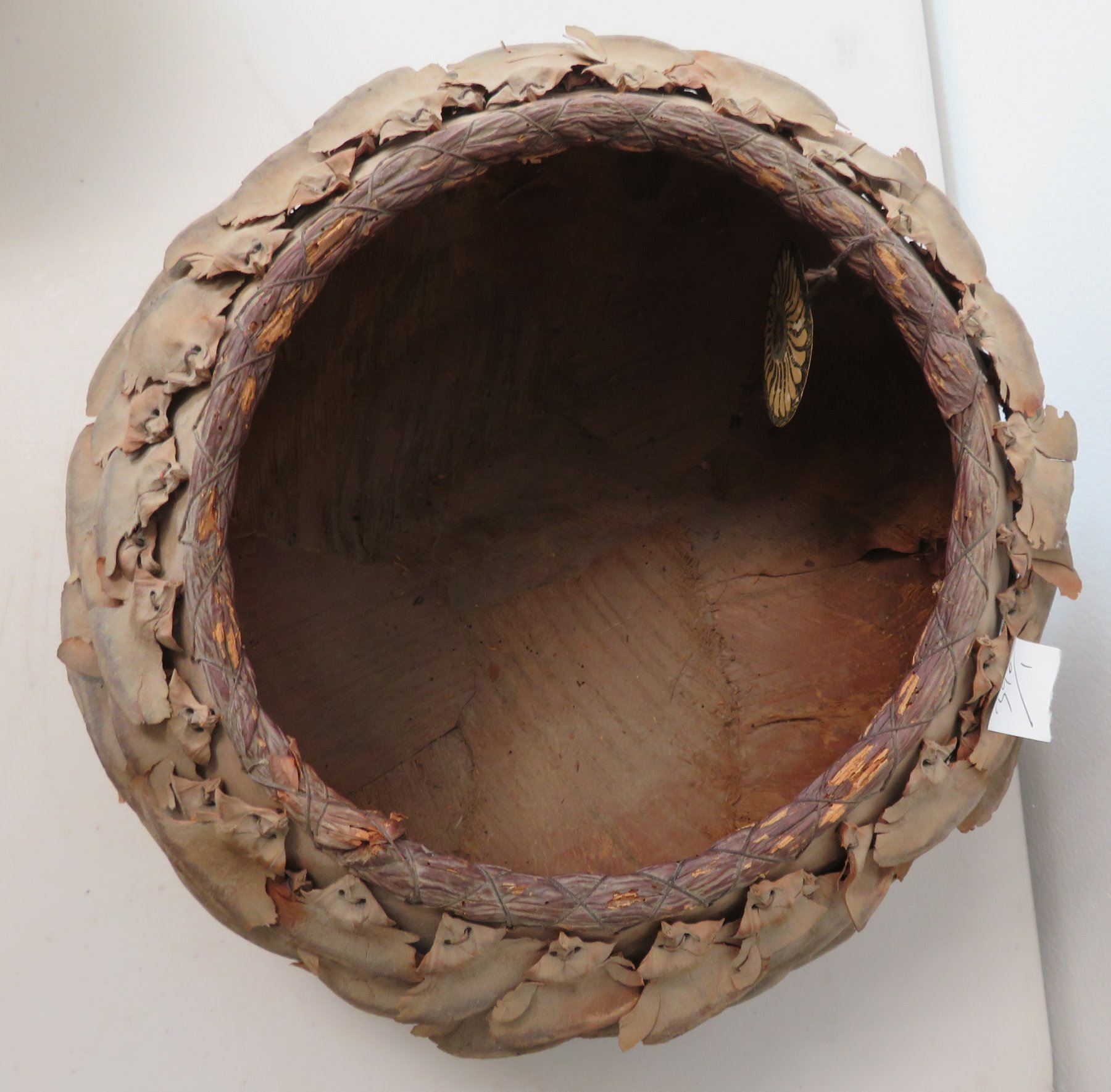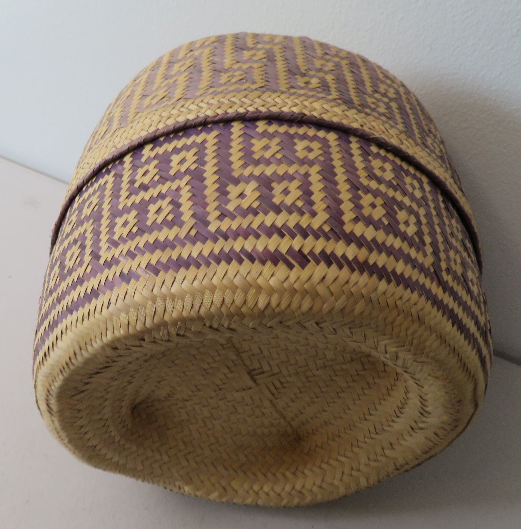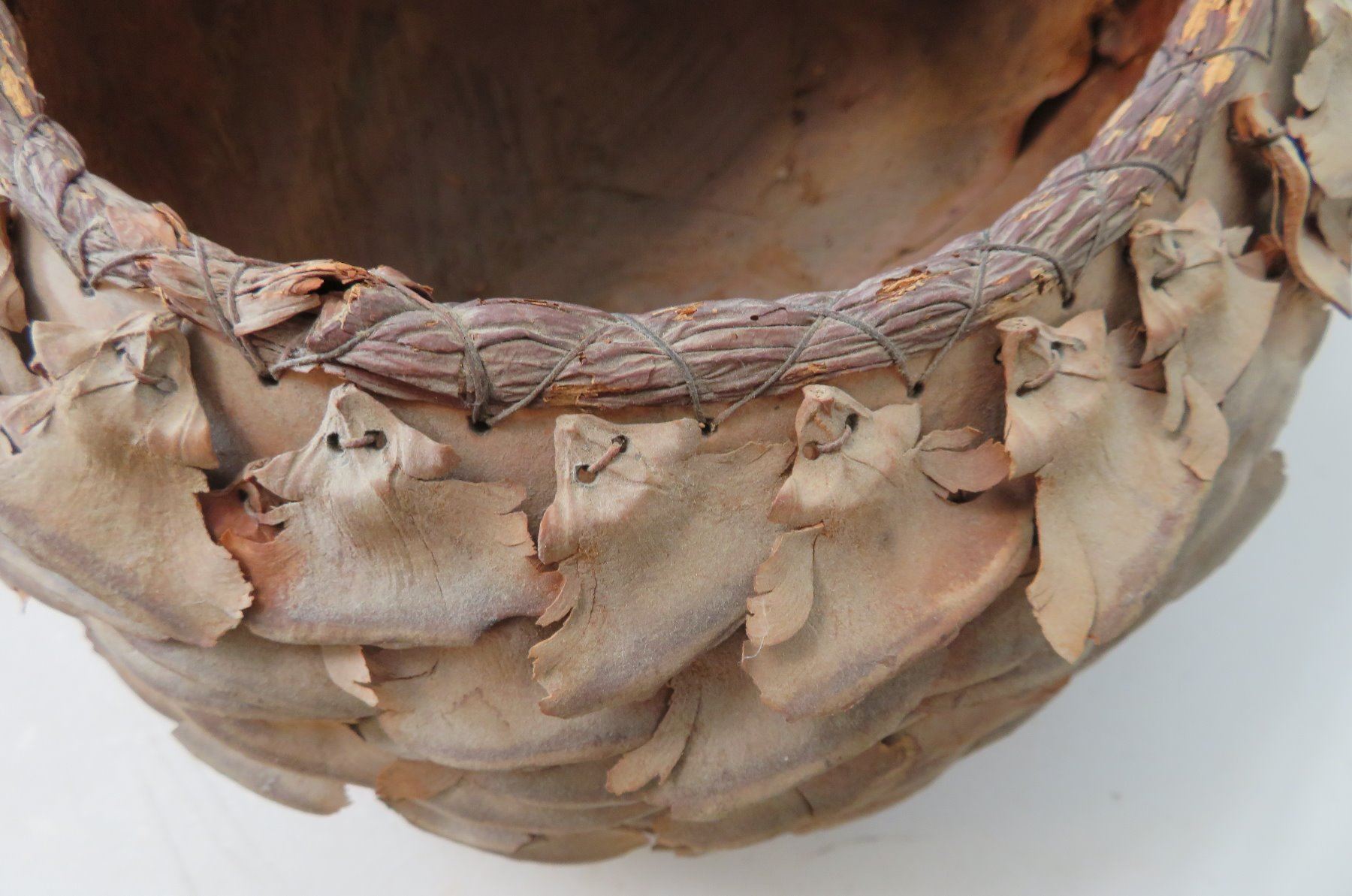 2 Mexican Baskets, c. 1940s. Made of grass, gourd and pine cones, the largest measures 10" x 7". Central Mexico, USA. One is not native. Condition: Sun faded, see images. Shipping: $32.50 w/insurance and signature, due to size.