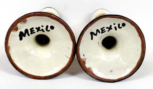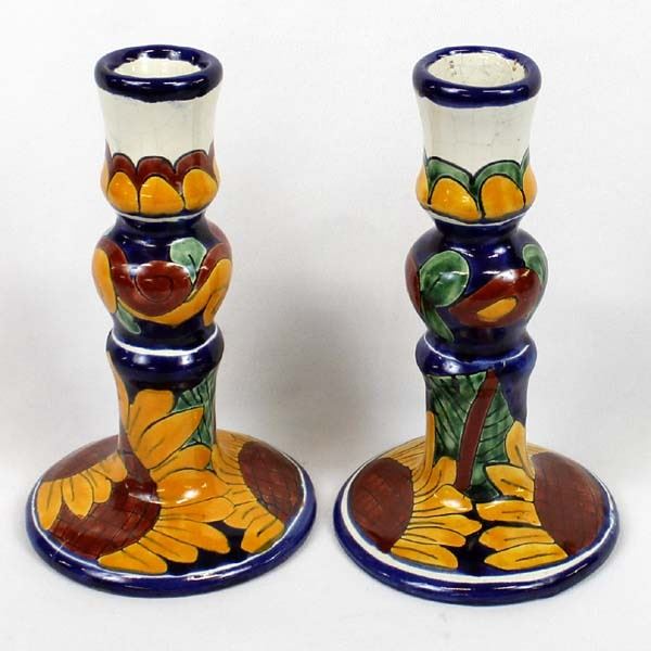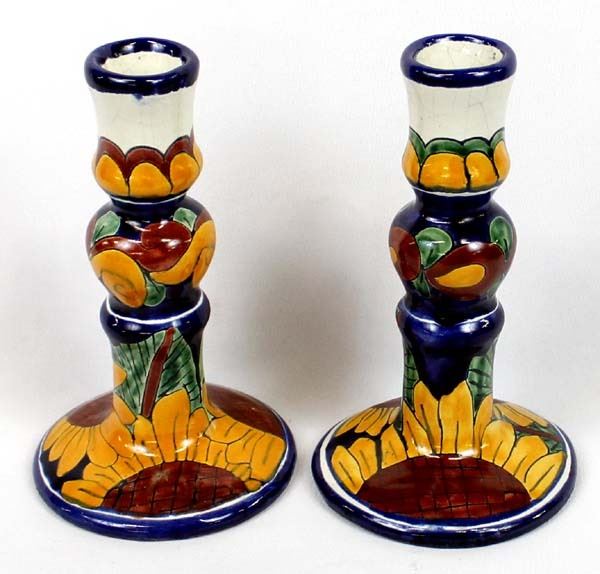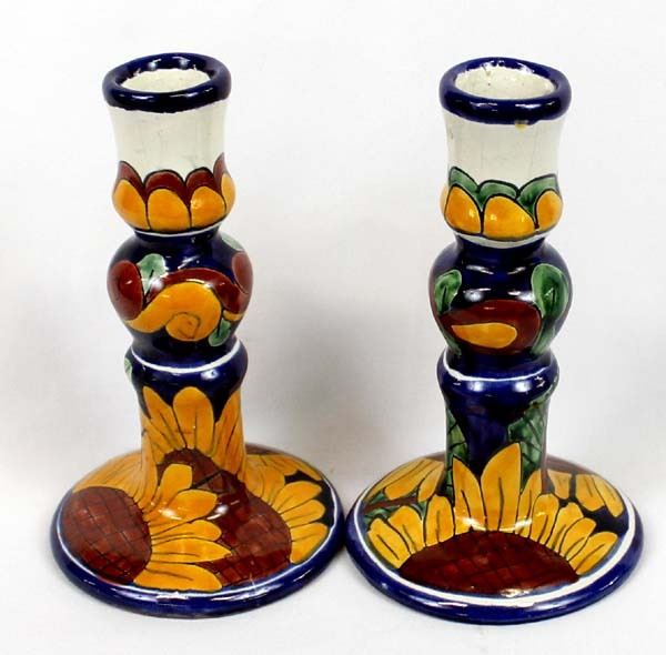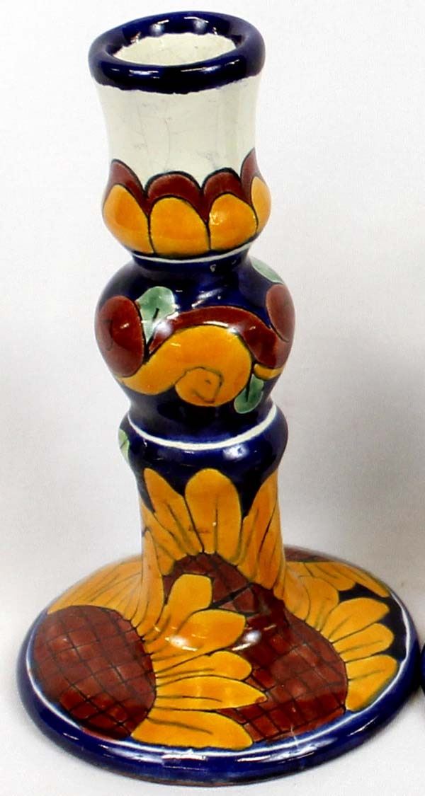 2 Mexican Glazed Pottery Candlestick Holders, sunflower motif, marked Mexico on the bottom, measure 8''H x 4.5''