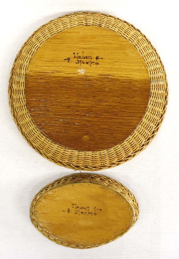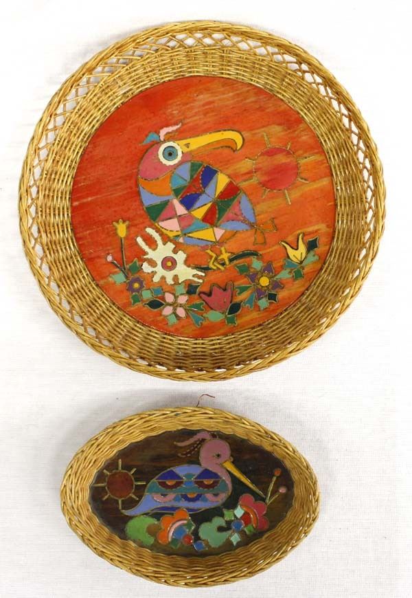 2 Mexican Hand Painted Wood and Wicker Baskets, largest measures 1.5'' x 9'', bird motif on both, beautiful colors