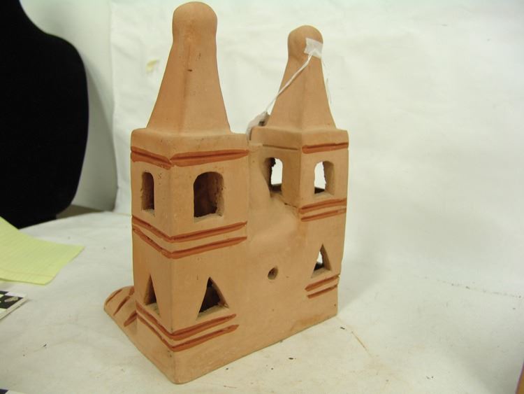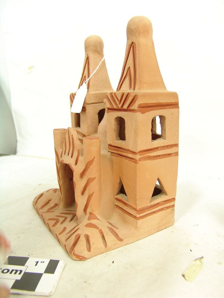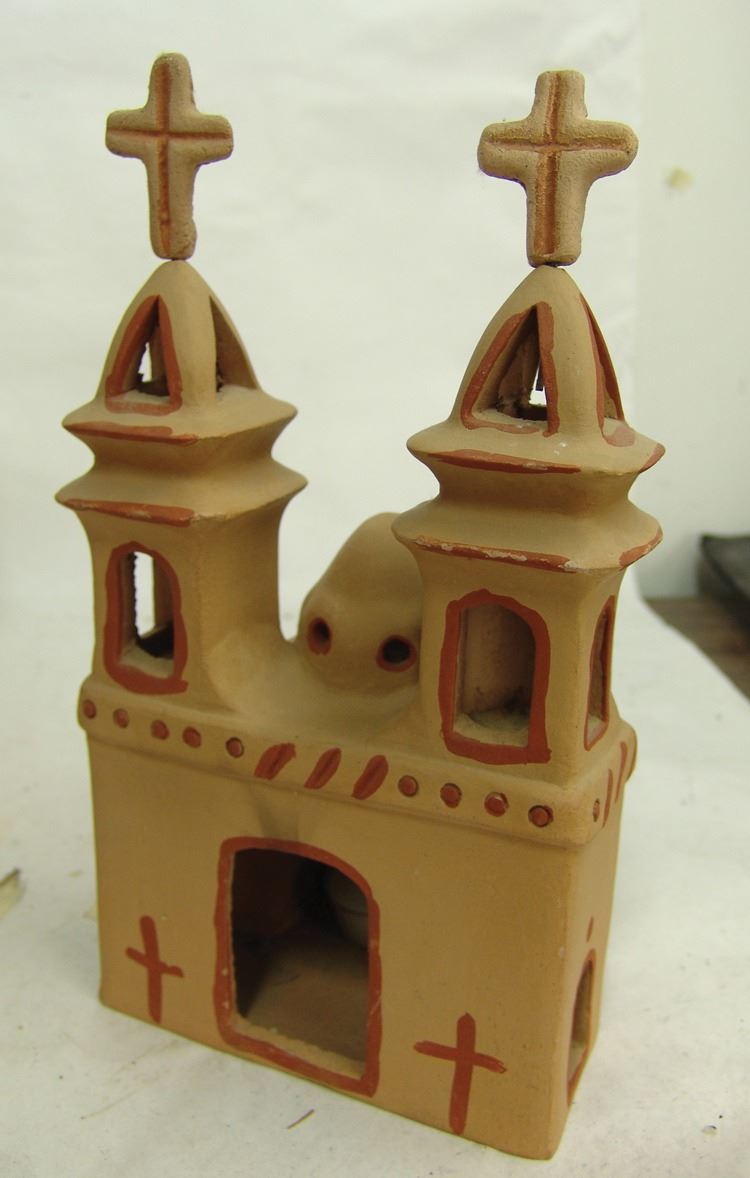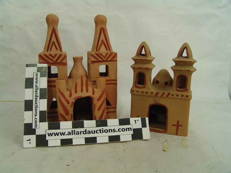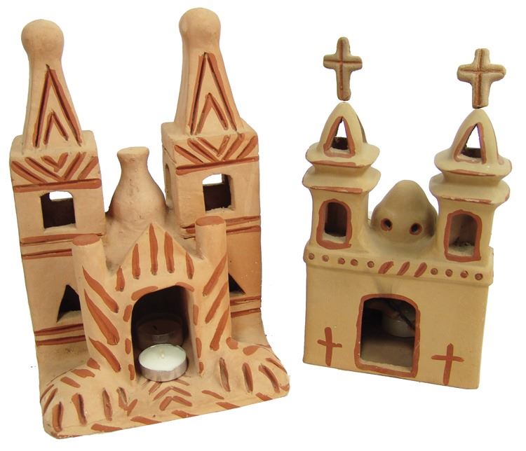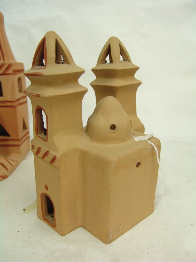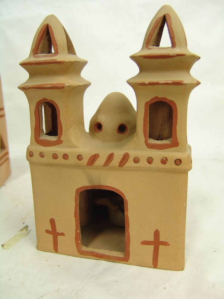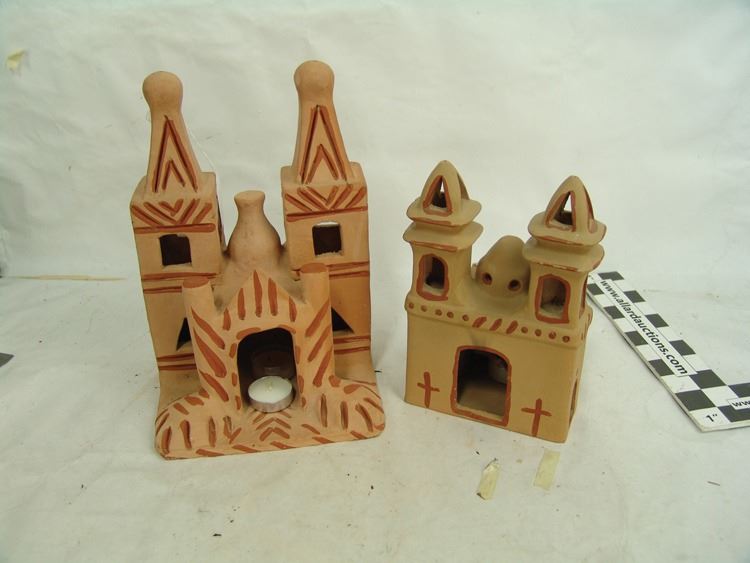 Pair of popular handcrafted clay "Luminaries", possibly by the same maker, the front openings used to insert the candles. The smaller has two removable crosses. Very good condition.,Ca. 1980s,Largest 12"
