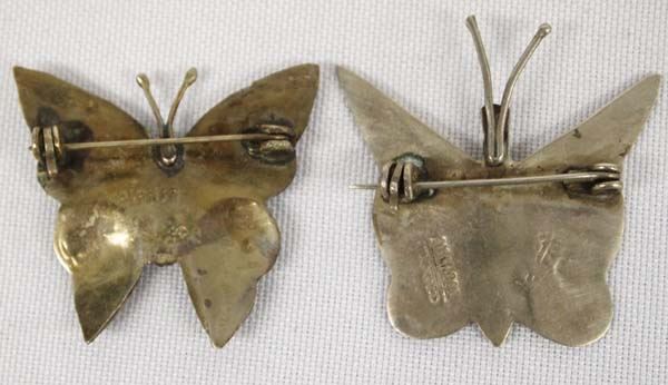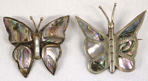 2 Mexican Sterling Silver Abalone Butterfly Pins, largest measures 1.5''L x 1.5''W, 7.62g in total wt.