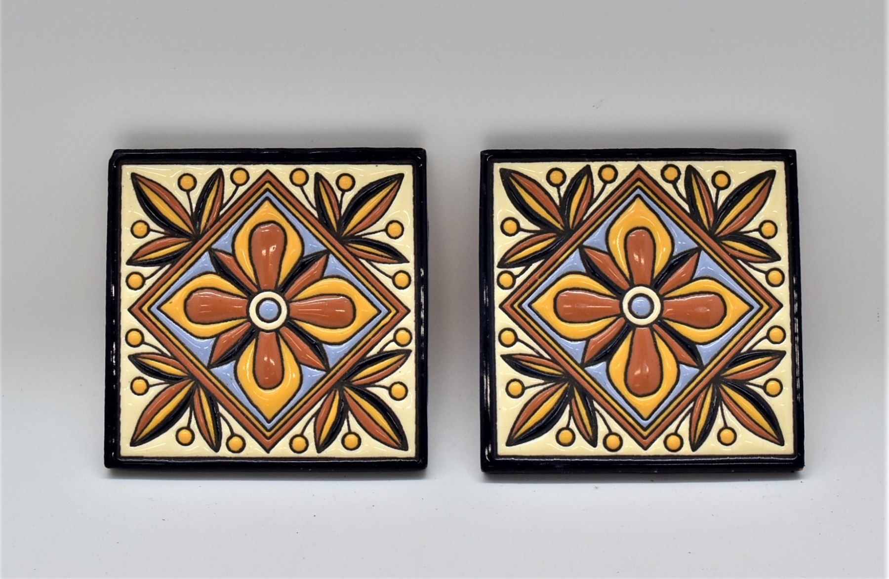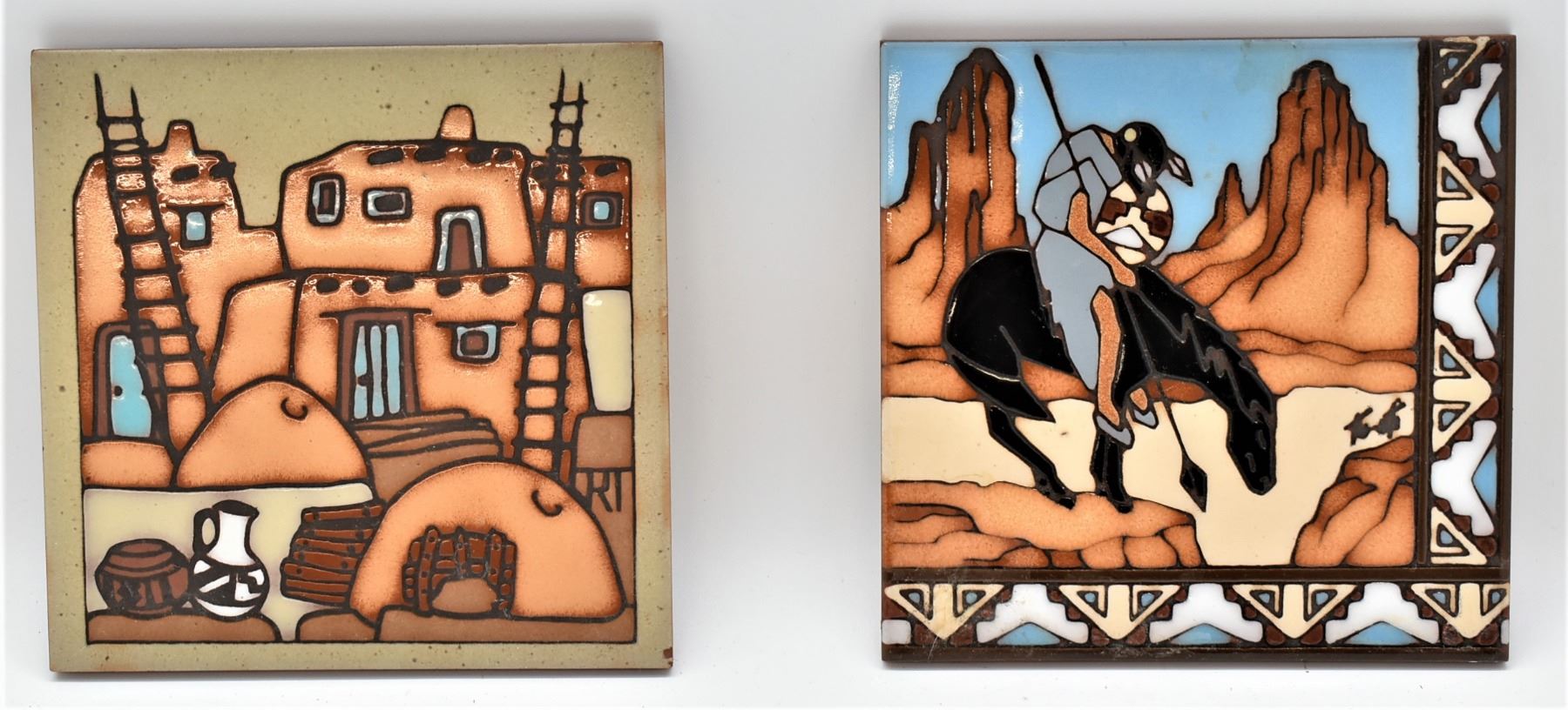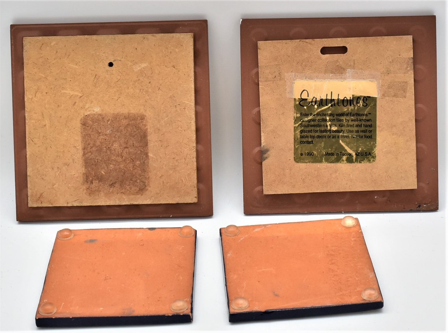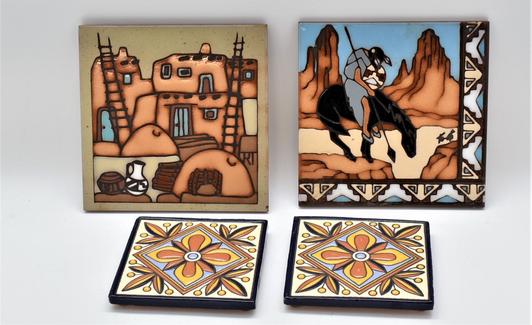 2 Mexican Tiles and 2 Ceramic Tile Trivets (1 Earthtones, the pueblo tile has a small nip in it), small measures 4'' square, large measure 6'' square