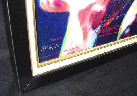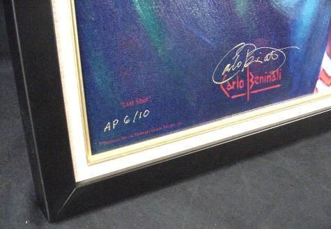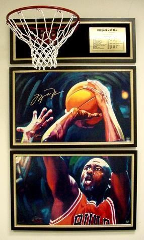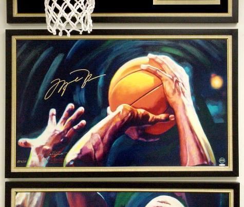Midwest Estate Buyers and Carlo Beninati are proud to present an original, exclusive and historic edition of six exciting images of the legendary Michael Jordan, created by renowned sports artist Carlo Beninati, and personally signed by Michael Jordan! Entitled THANKS FOR THE MEMORIES, this very prestigious limited edition series of museum quality fine art mixed media serigraphs on canvas commemorate his closing chapter of history on the basketball court. Each print is personally signed by Michael Jordan and artist Carlo Beninati. These prints are a spectacular tribute to the incomparable career of the greatest superstar in the history of basketball, and perhaps the greatest athlete who has ever lived!This auction is for the two print suite, "LAST SHOT"- Each image is 22x 36 Museum quality mixed media serigraphs on canvas Exclusive limited numbered edition of 23 * Both images are signed by Carlo Beninati Upper Deck Authenticated (UDA) Michael Jordan autograph on the top image only Published by Midwest Estate Buyers Two piece suite shown framed; winner will receive the two prints unframed ** Basketball hoop and plaque shown in the auction photos is available for purchase separately as an accent for the dynamic display of the two-piece suite UDA will authenticate each historic print with their patented five-step process. The validity of the autograph will be further documented through the use of PenCam, Upper Deck Authenticated state-of-the art technology that captures the actual superstar's signing of your print on digital video. Carlo Beninati was exclusively selected for this special project, above all other sports artists, by Upper Deck Authenticated (UDA). The artist's reputation and prestigious client list speak volumes about his lifetime of dedication to excellence in every aspect of his work. Few artists can boast a client list equal to his. Fortune 500 companies, political, entertainment, and sports personalities have commissioned him. His work has also been included in prestigious public and private collections and is prominently displayed by collectors, galleries, and museums worldwide. He was the first artist to acquire a project for autographed fine art featuring Joe DiMaggio, and also Ted Williams. Beninati says,"I am truly humbled and honored that my signature accompanies the greatest sports heroes and legends of our time." Each individual print is hand-pulled using the finest printing technologies. In addition, each fine art mixed-media serigraph is hand-inspected by Beninati to ensure the highest level of excellence. This is a unique opportunity to acquire one of the most sought after sports autographs in the world, completely authenticated and signed prominently on a museum quality print created by a noted artist. We expect this very limited edition to sell out quickly. When they're gone, so is your opportunity to own this powerful, impressive and historic work of art. * Please note that requests for specific edition numbers may be considered. ** Framing can be arranged Midwest Estate Buyers is pleased to announce an historic first! For the first time ever, Upper Deck Authenticated has granted Carlo Beninati and MEB the rights to produce the first authorized fine art, limited edition autographed prints of golf legend Tiger Woods. Click on the link below to see more images in the THANKS FOR THE MEMORIES series and the exciting "TIGER ROARS!" Contact Midwest Estate Buyers 847-412-9900 for further information.