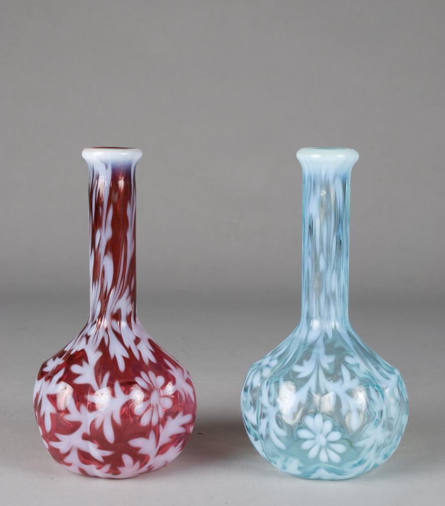 Includes a blue daisy & fern bottle, 7.5" H. Together with a cranberry daisy and fern bottle, 7.5" H. Both with bulbous base and decorated with opalescent daisy and fern designs. Excellent condition.