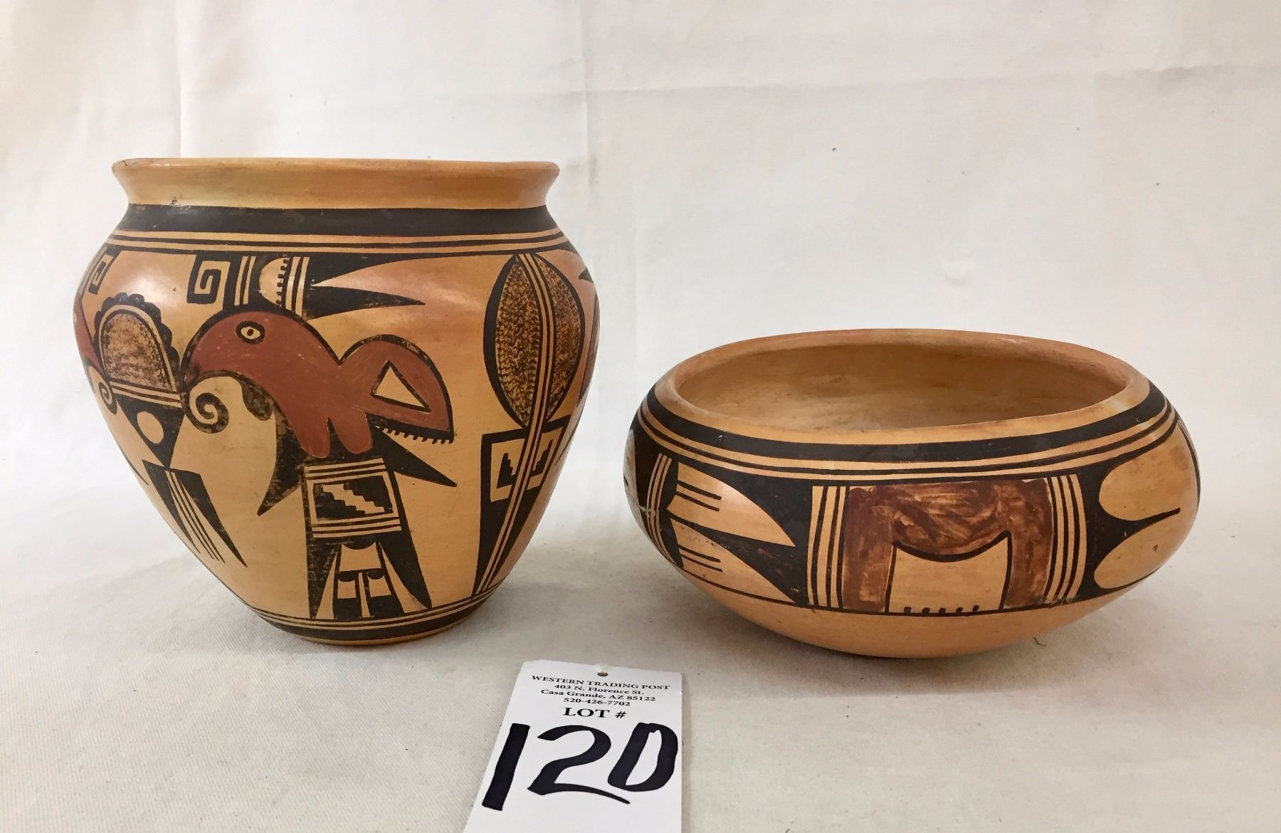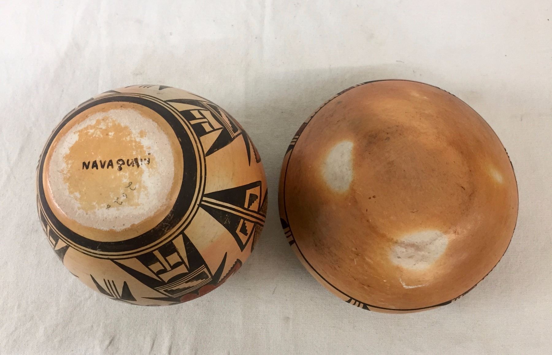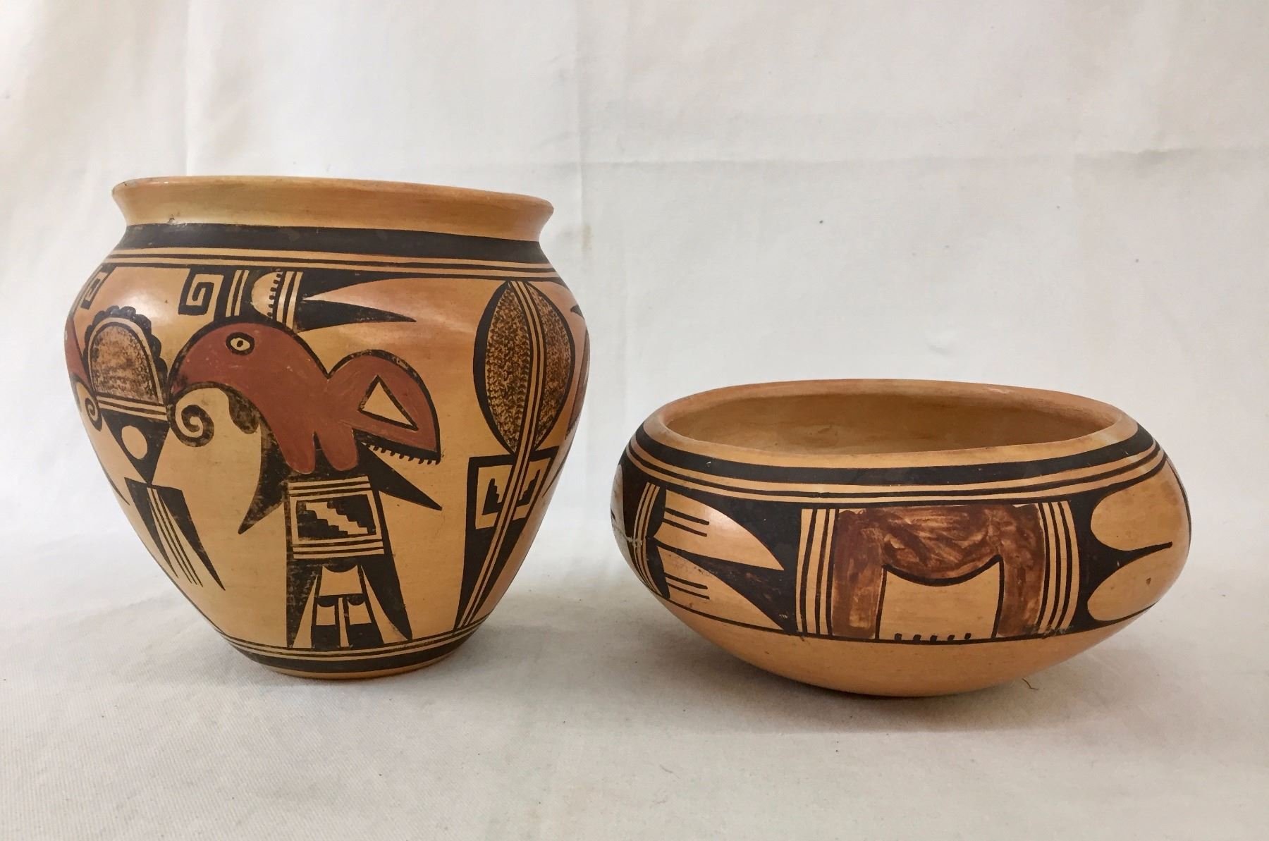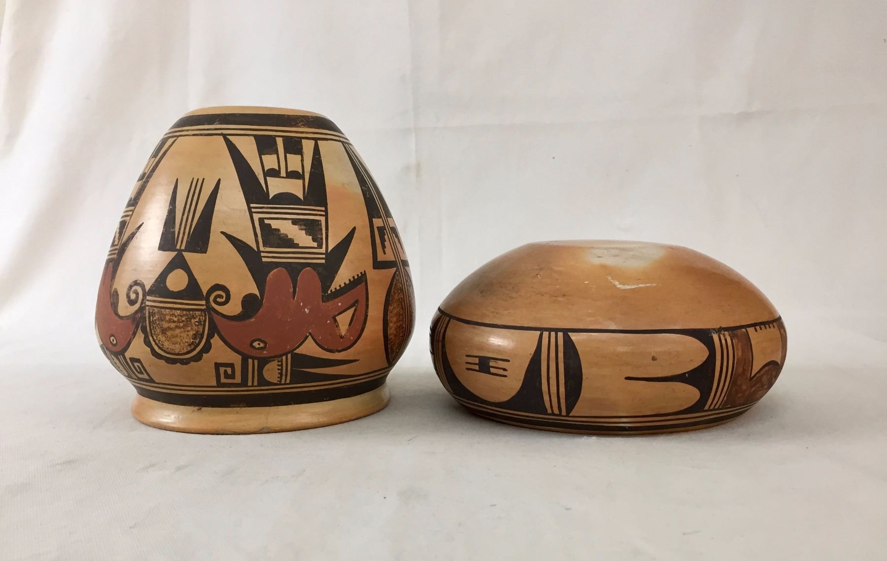 Description: Two mid-century hopi pots. One has its original tag from the Museum of Northern Arizona dated 1950. Maker: The one with the tag is by Lucille Navaquavi and the other is not signed. Approx. Age: Mid-century. Size: Measure from 6-1/2”w x 6-1/2”h to 7-1/4”w x 3-7/8h. Condition: Good for its age, normal wear expected. Please look closely at the pictures - they are an important part of our description. Shipping: There will be a $10 handling / packaging fee for shipping this lot. The actual cost of postage will be added on top of that.