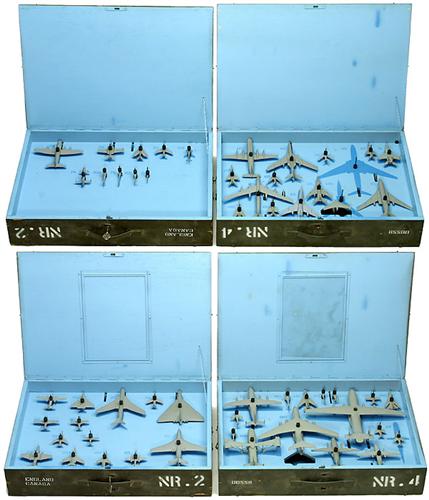 2 militärische NATO-Übungskoffer "Flugzeug- modelle", um 1970 2 große Holzkoffer in NATO-Oliv, jeweils zweiseitig zu öffnen, mit ca. 40 Modellen Militär-Flugzeuge aus Rußland, England und Kanada, komplett bis auf ein Modell. - Selten auf dem freien Markt zu finden!