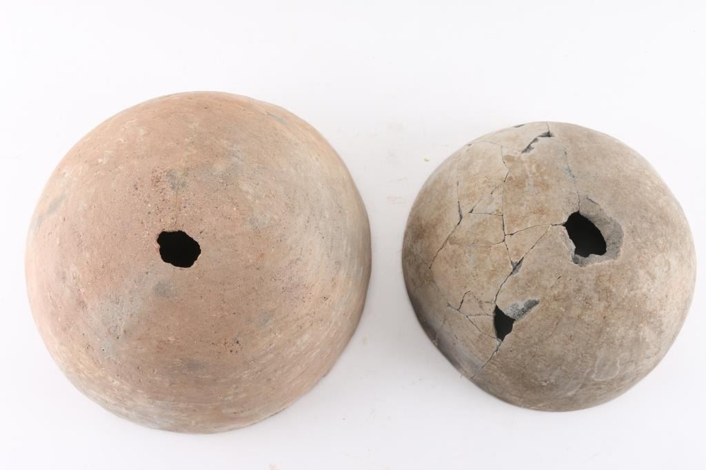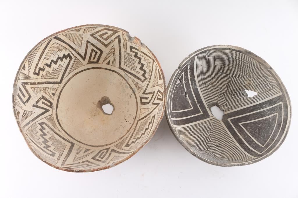 Completely restored black and white pot with geometric design. Four small losses. Measures 9" in diameter and 4" tall. From the Steve Goldstein Collection, Scottsdale, AZ. And one other measures 7"x4"