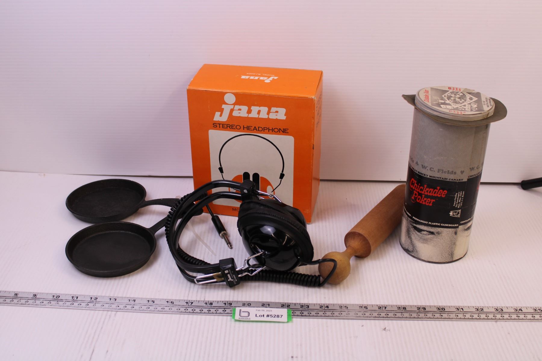 (2) Mini Cast Iron Pans, Vintage Jana Headset, and Chickadee Poker Set