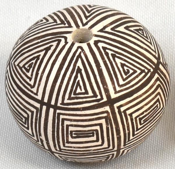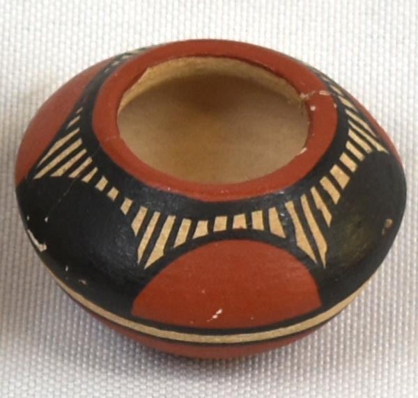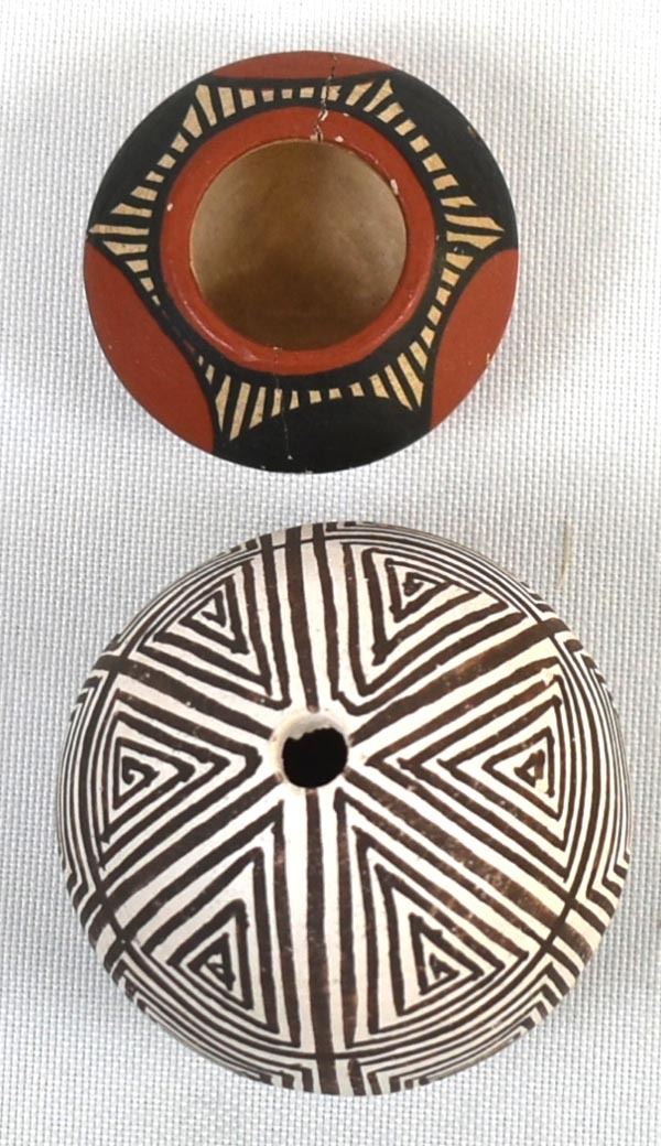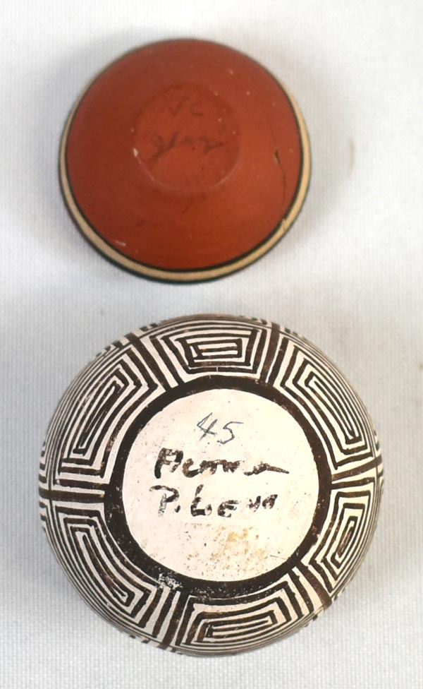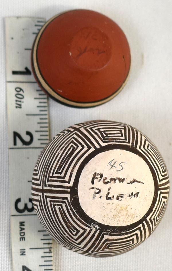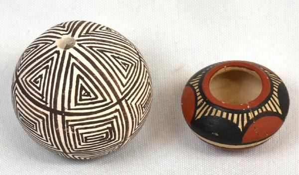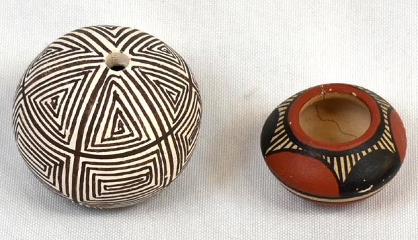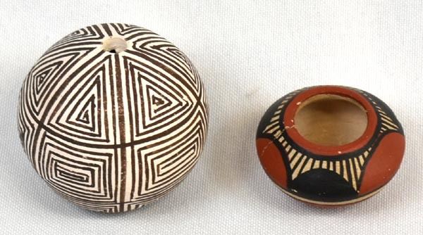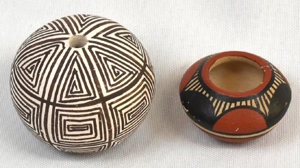 2 Miniature Native American Pottery Jars, includes 1. Acoma Eye Dazzler by Phyllis Leno (b. 1943), measures 2'' x 2'' and is signed on the bottom 2. Jemez by J. Chinana and measures 1'' x 1.5'' and has artist's initials on the bottom