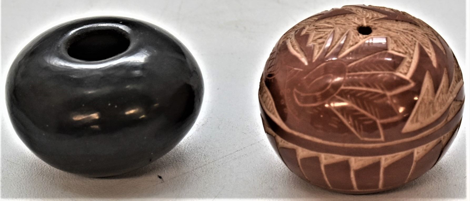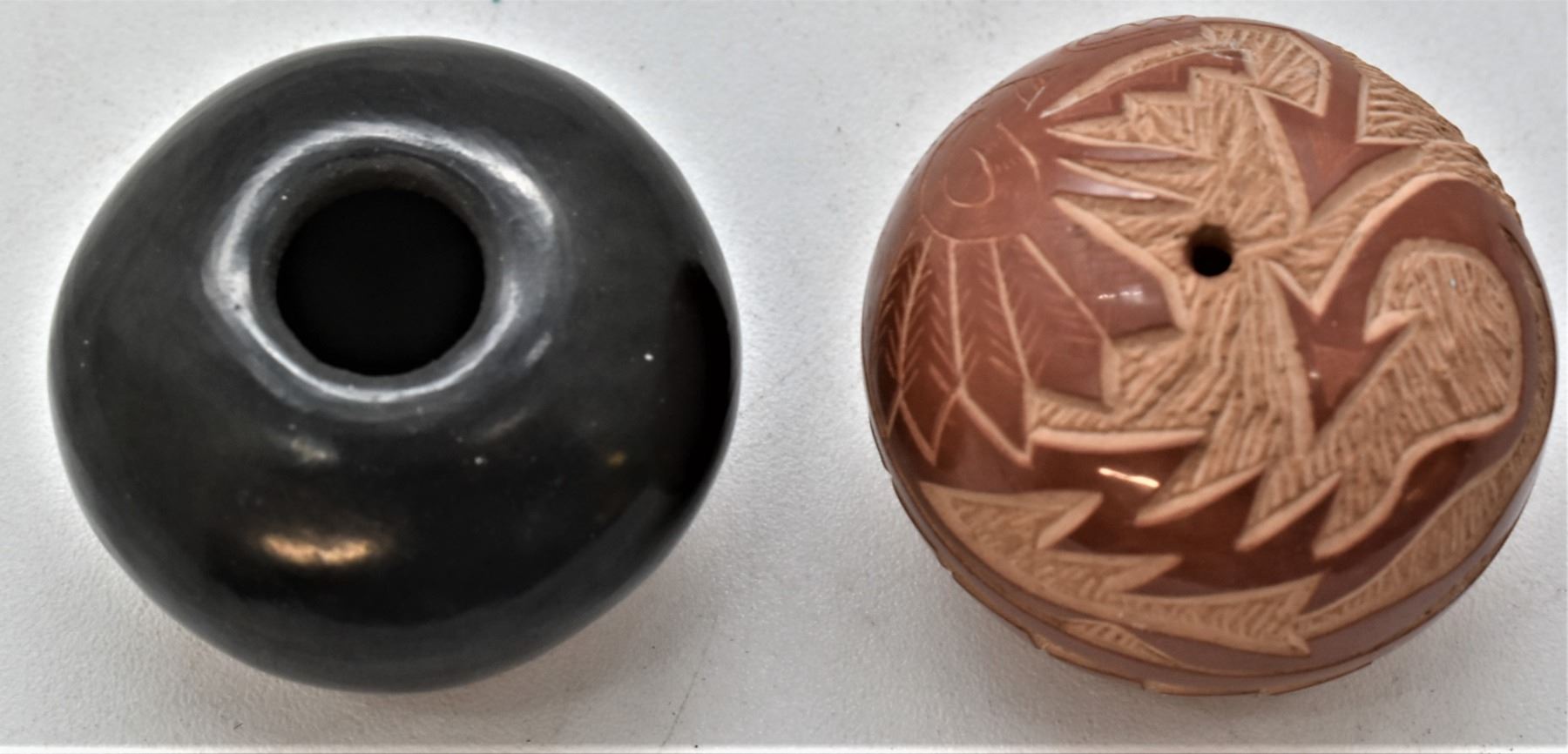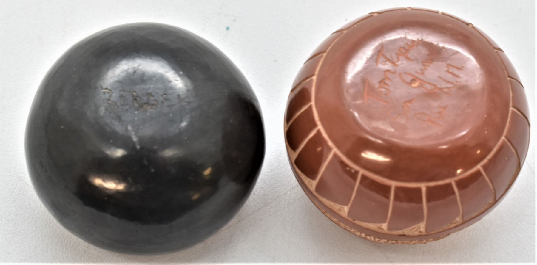 2 Miniature Native American Pottery Jars, includes 1. San Juan Pueblo Carved Avanyu Pottery Seed Jar by Tom Tapia, measures 1.5''D x 1''H and signed on the bottom, FYI: ''Tom Tapia (1946-2015) was a well-known potter from the San Juan Pueblo. He was the son of the famed potter, Sue Tapia. His award-winning and intricately-etched pots have made their mark at various venues such as the Santa Fe Indian Market and the Heard Museum Indian Fair.'' 2. Santa Clara Blackware Pottery Bowl by Berdell Bourdon, measures 7/8'' x 1 3/8'' and is signed Berdell on the bottom