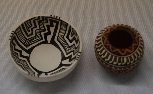 2 Miniature Pottery Jars, 1 Acoma, largest measures 1''H x 2''W, the black and white one is signed ''TMS '88 Roosevelt B/W and the other is signed gB