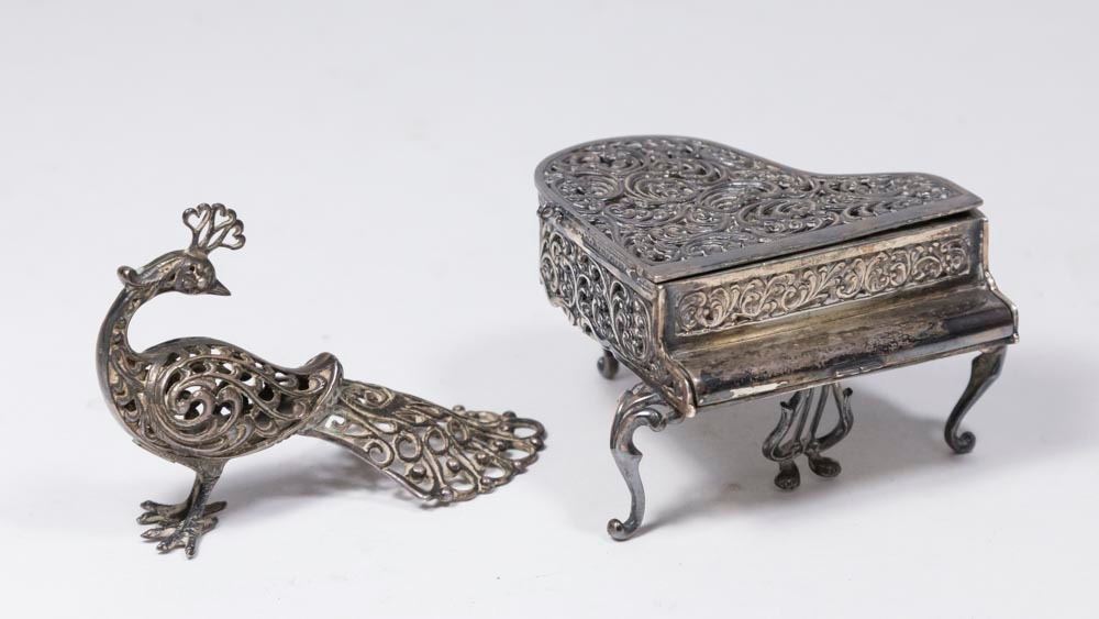 Piano approx. 1 5/8" H x 2 1/2" L; and peacock. Top on piano not attached.