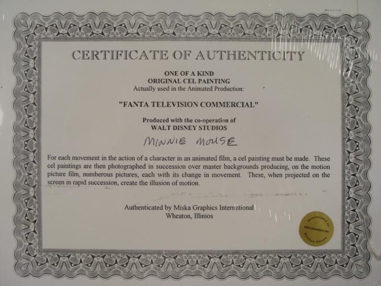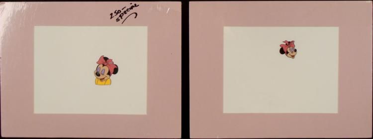 These are two original animation cels used in the production of a 1980's Fanta soda commercial. Minnie Mouse looks very pretty in her pink bow, and she was probably enjoying a Fanta soda with Mickey! * Medium: Hand-inked and hand-painted acetate celImage size: 10 x 7 1/2 inchesPresentation: Double matted in pink and whiteMatte size: 16 x 12 inchesCondition: Excellent; sealed in cellophaneCertificate of Authenticity: One included